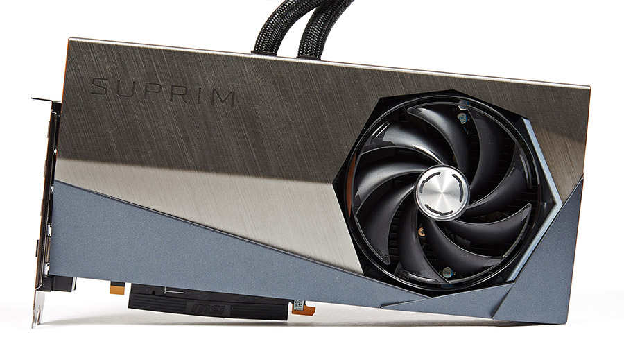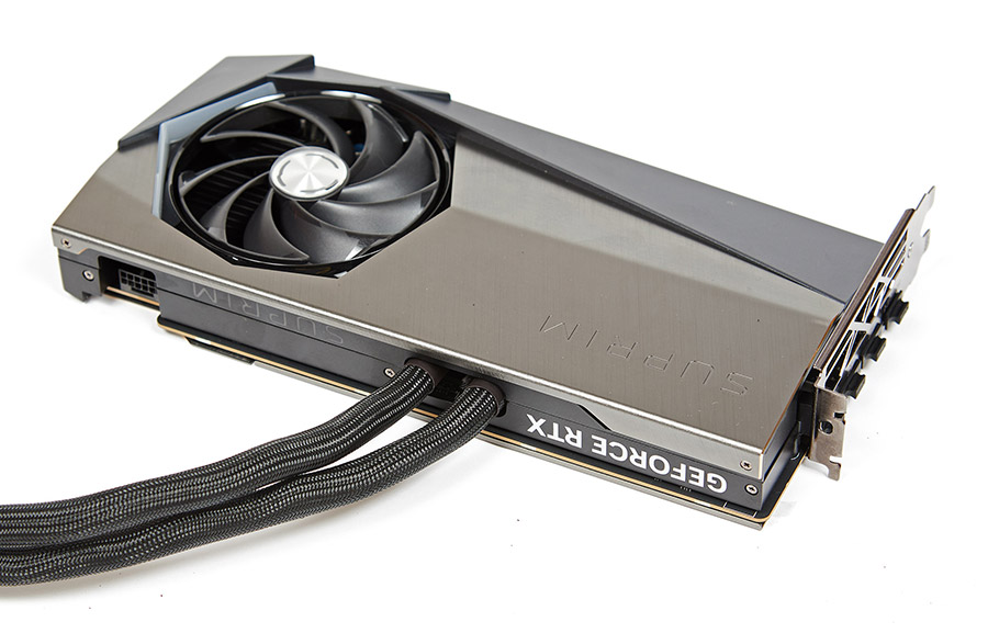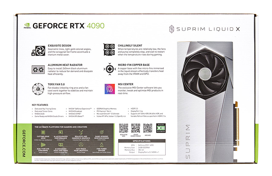 Карта виконана в сучасному стилі Suprim та займає лише два слоти. Можна подумати, що цей графічний адаптер, довжиною «лише» 280 мм, має на борту GPU на кшталт GeForce RTX 4060, який ще не вийшов, але це не так. Під кришкою Suprim Liquid X знаходиться топове ядро AD102 та 24 ГБ відеопам’яті, а потужність карти складає 480 Вт. Завдяки саме системі рідинного охолодження вдалося так зменшити розміри та, відповідно, вагу адаптера.