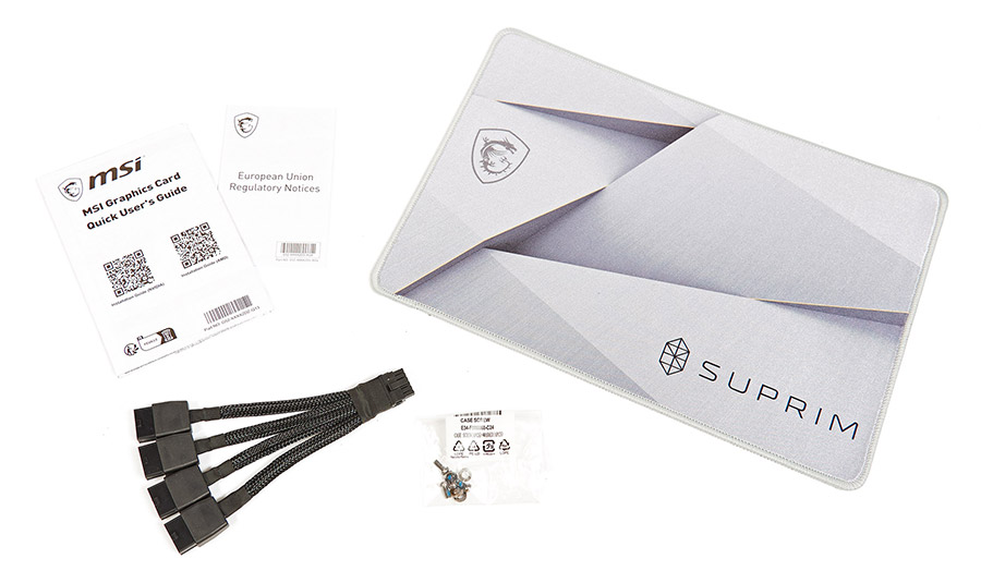 В комплекті документація, фірмовий килимок для мишки, перехідник живлення на чотири звичайні 8-контактні роз’єми та набір монтажних гвинтів для радіатора.