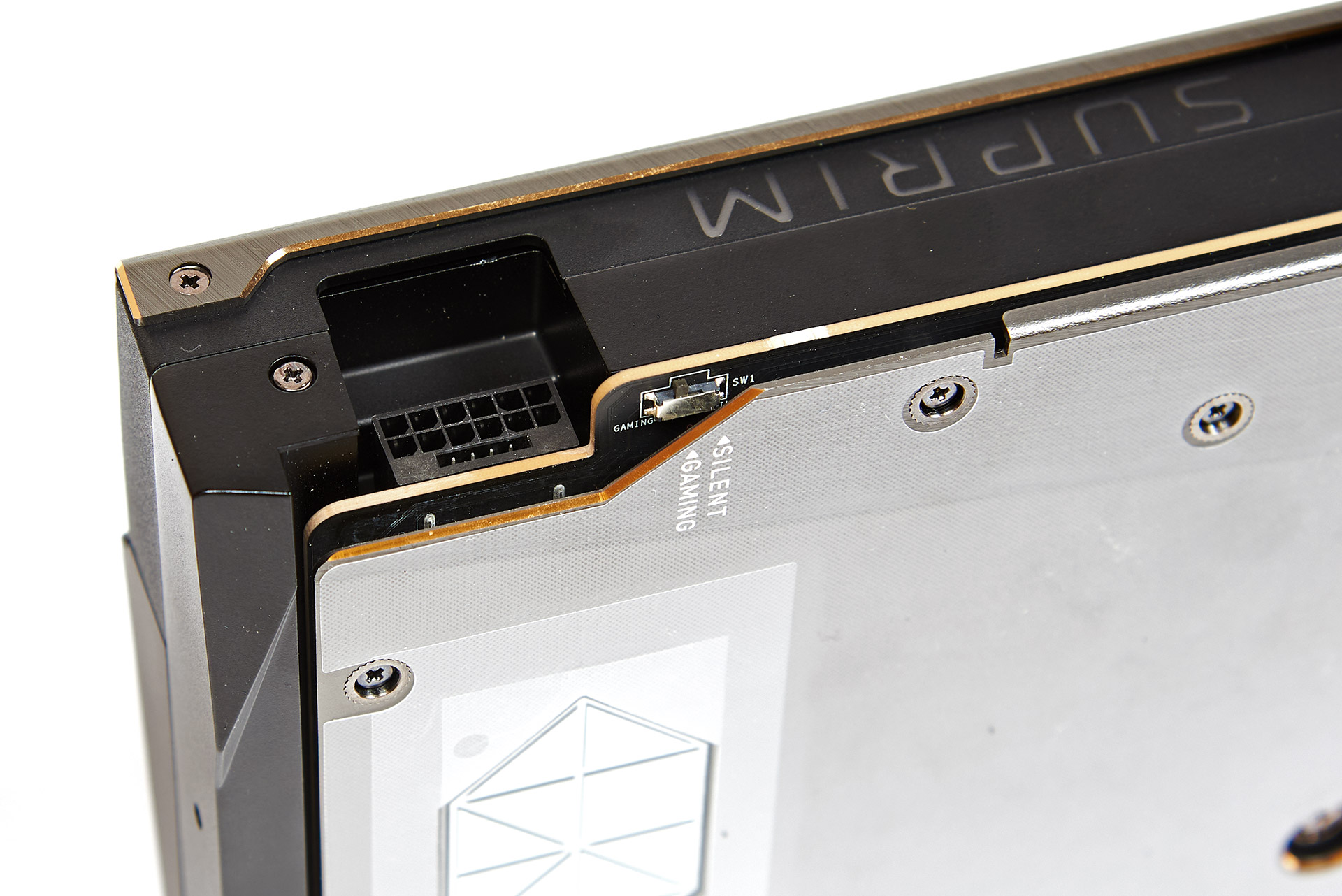 Зверху на краю присутній роз’єм 12VHPWR та перемикач BIOS між режимами Game та Silent.