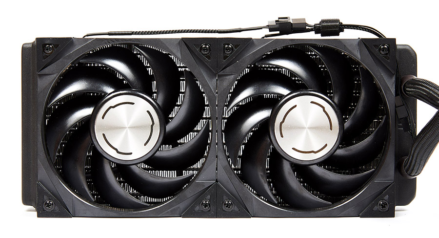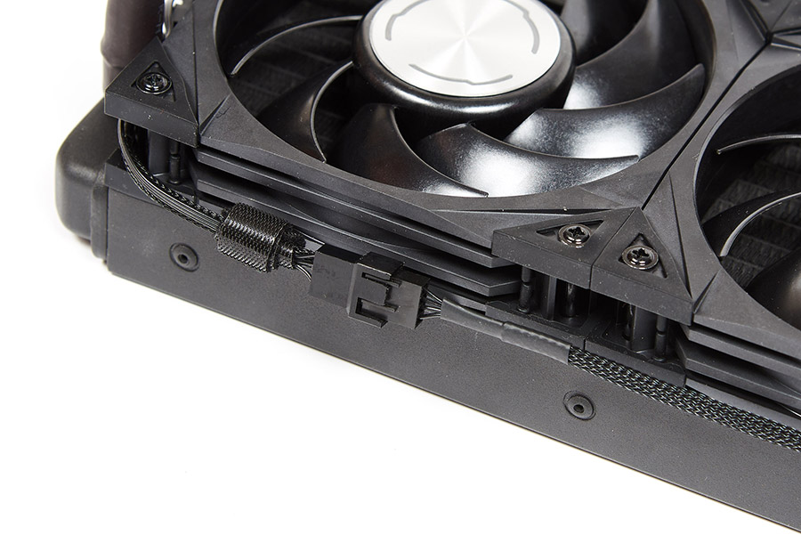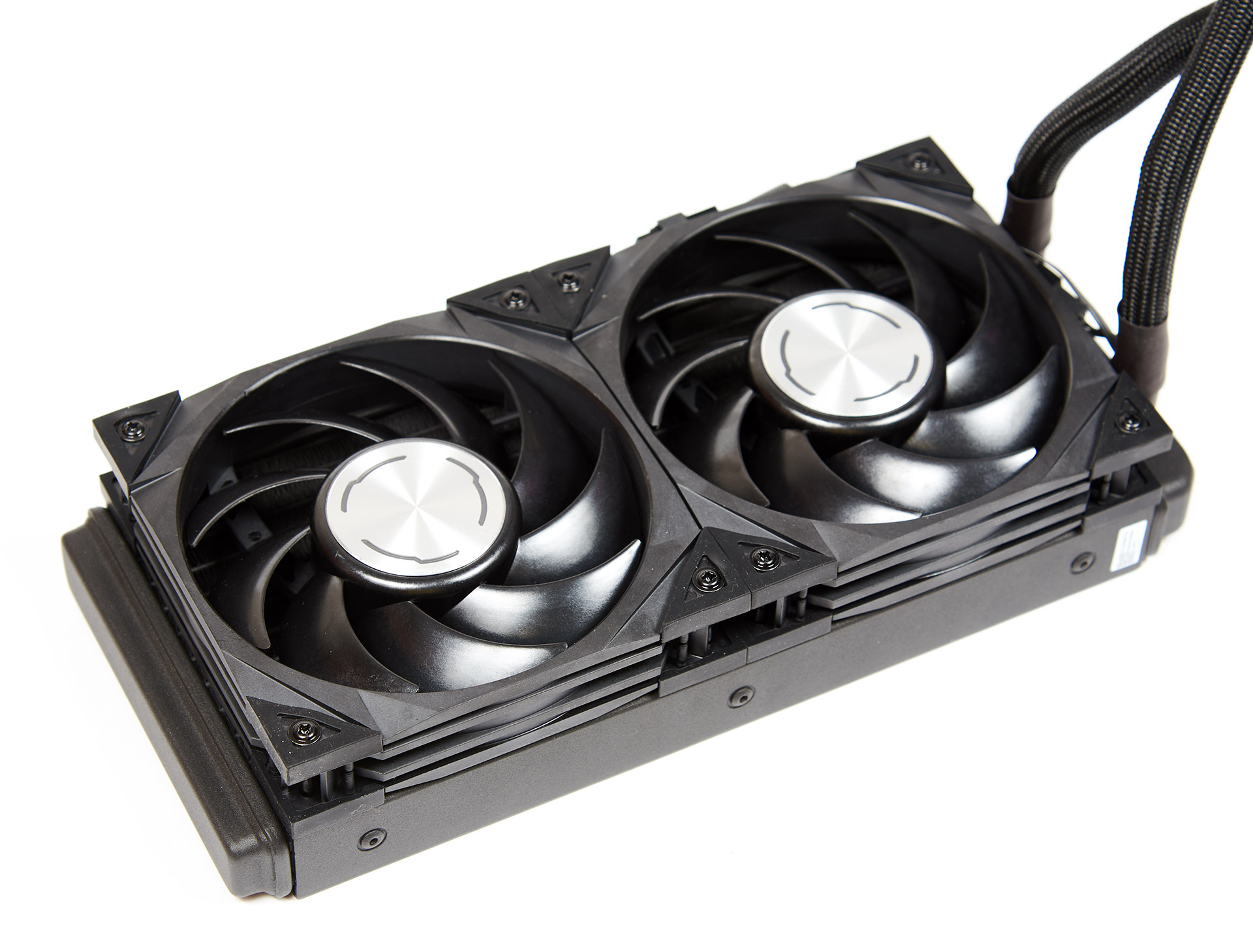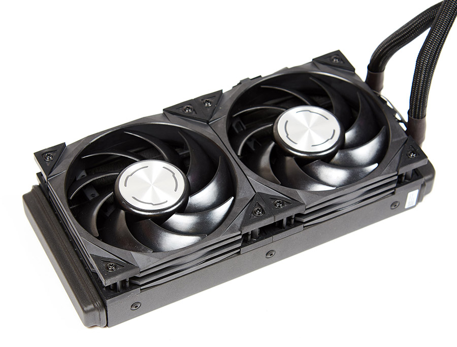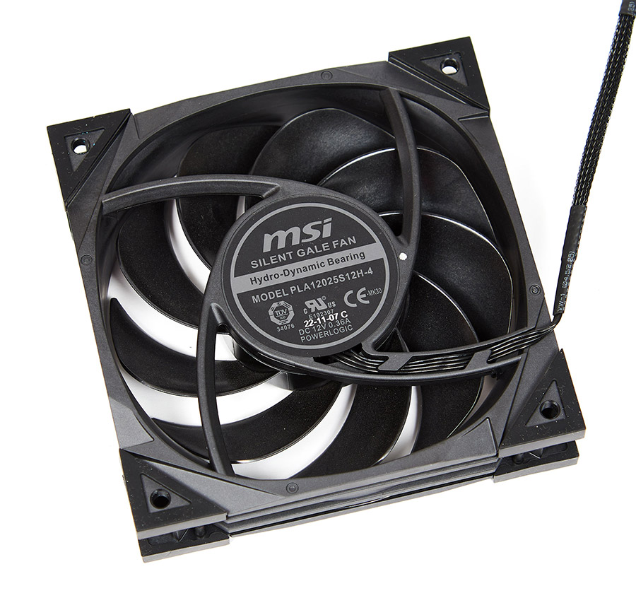 Вентилятори MSI PLA12025S12H-4 виконані з гідродинамічною вальницею, ШІМ-регулюванням та мають звичайний 4-контактний роз’єм. Такі ж самі моделі можна було зустріти в AiO для процесорів виробництва MSI. По кутах встановлені гумові демпфери для зниження передавання вібрацій від вентилятора до радіатора.