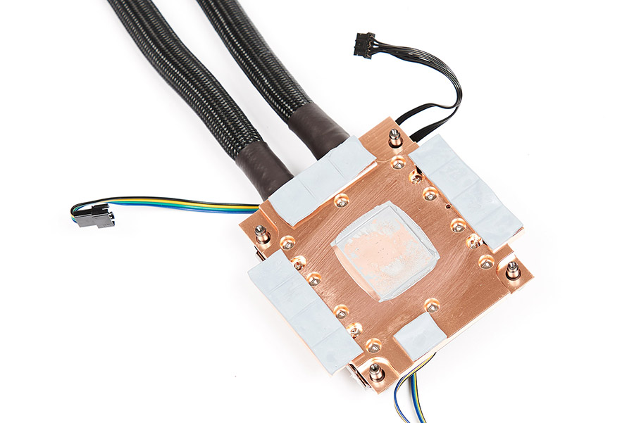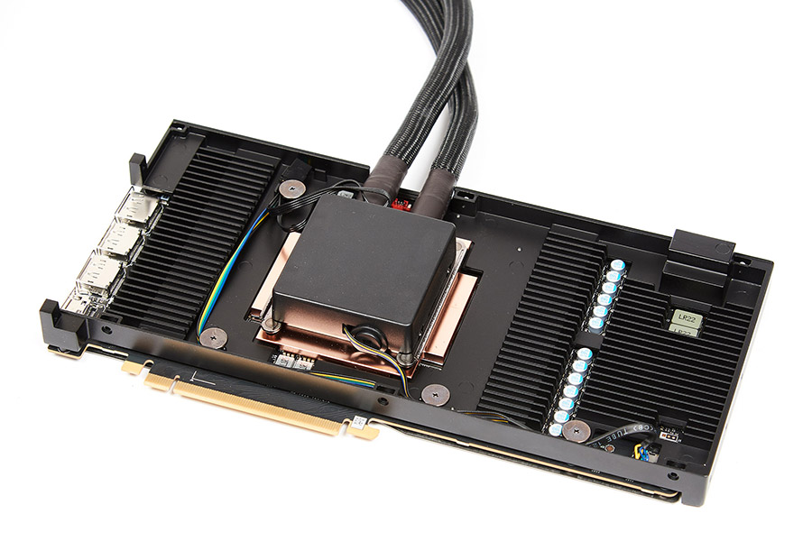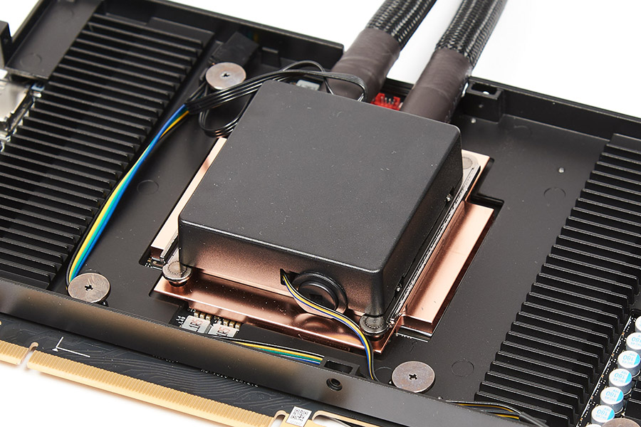 Над чипом встановлена комбінована помпа, яка відіграє також роль водоблоку. Вона охолоджує не тільки GPU, але й пам’ять також, що позитивно повинно вплинути на їх температурний режим. Тепло від графічного процесора передається через термопасту, тоді як для чипів пам’яті застосовано термопрокладки невеличкої товщини.
