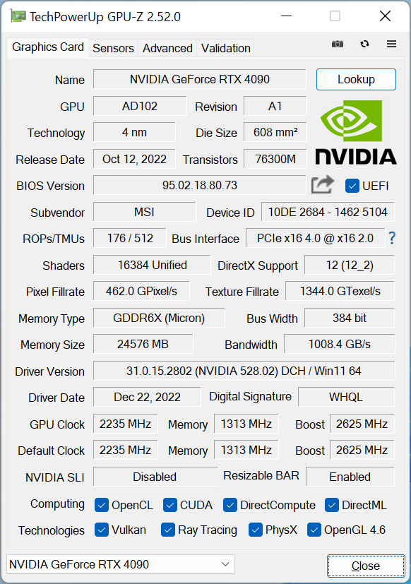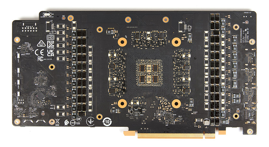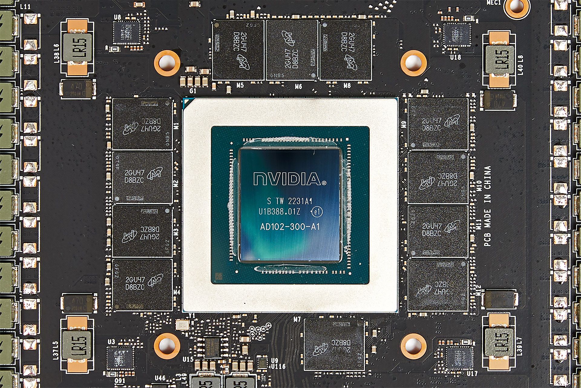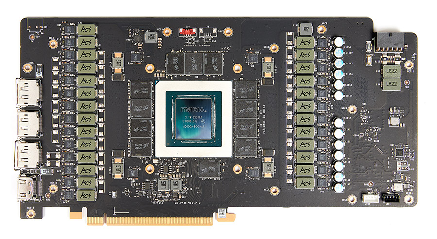 На платі встановлено чип AD102-300-A1 із захисною рамкою, який взаємодіє через 384-бітну шину з відеобуфером на 24 ГБ, набраним з 12 мікросхем Micron 2MU47D8BZC.
