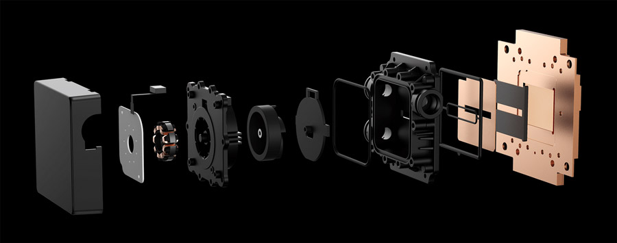 Конструктивно помпа схожа з продуктами для охолодження процесорів, особливо, від компанії Arctic, і має пластину-теплообмінник з мікроканалами напроти кристалу GPU, пластину для прискорення потоку рідини, великий імпелер й корпус з двигуном та платою керування. Присутня також пробка для доливання рідини, що зустрічається не так вже й часто.
