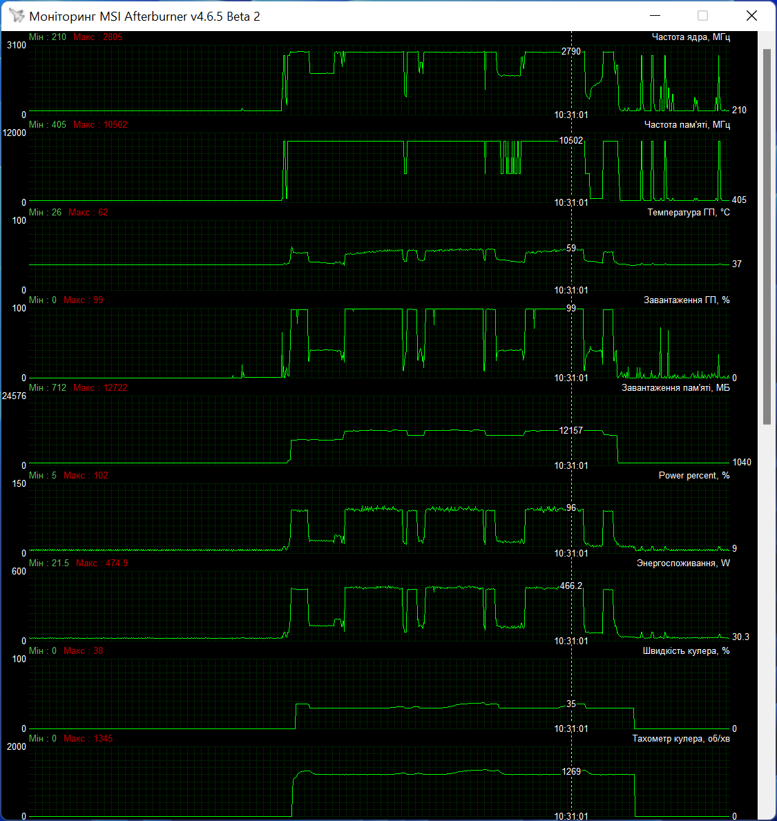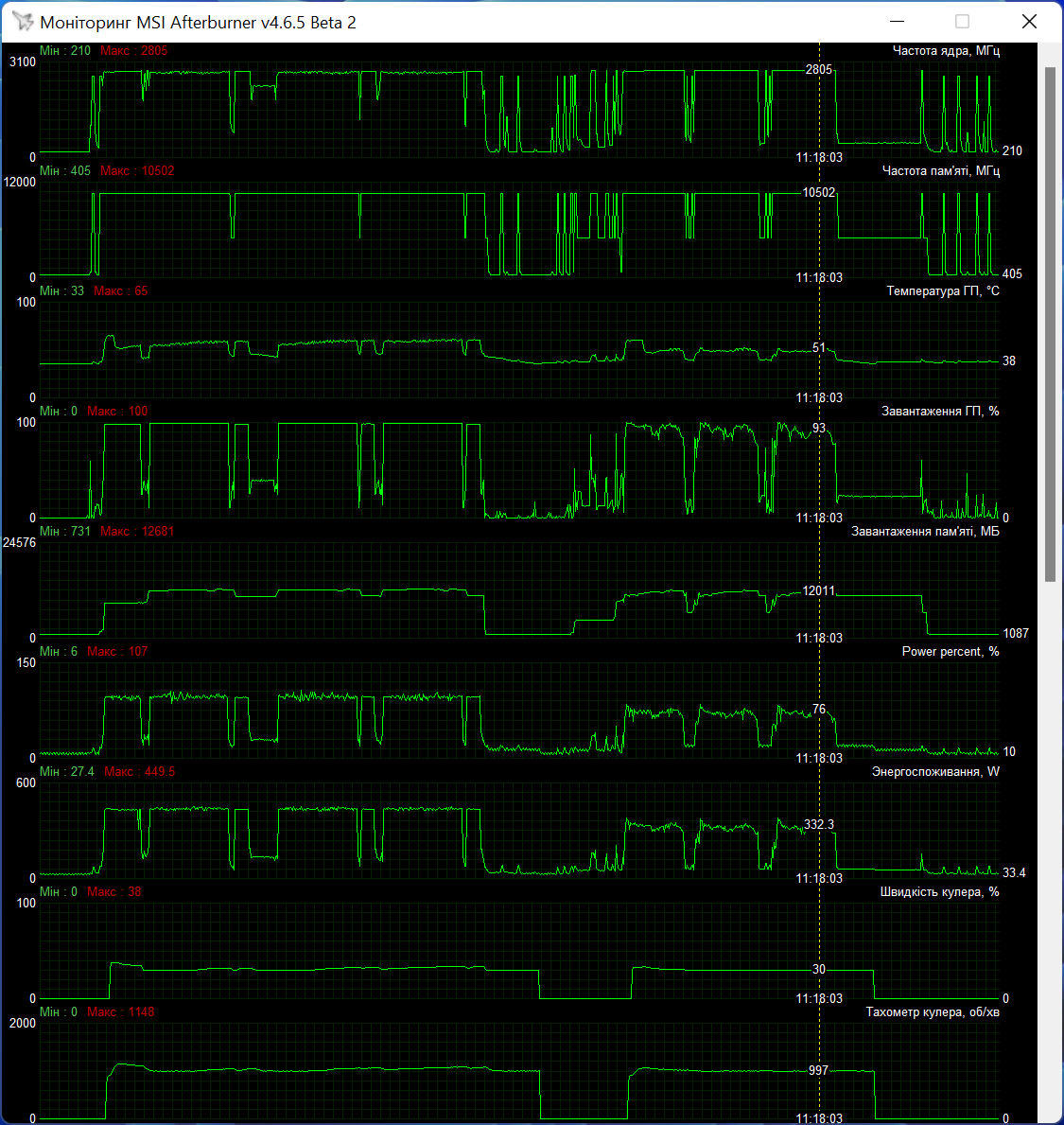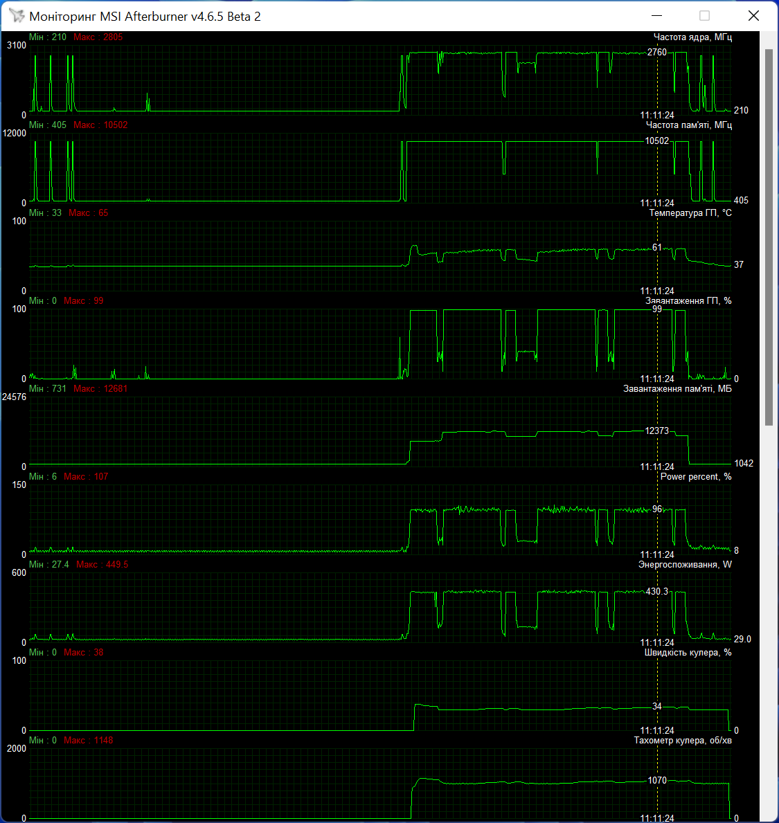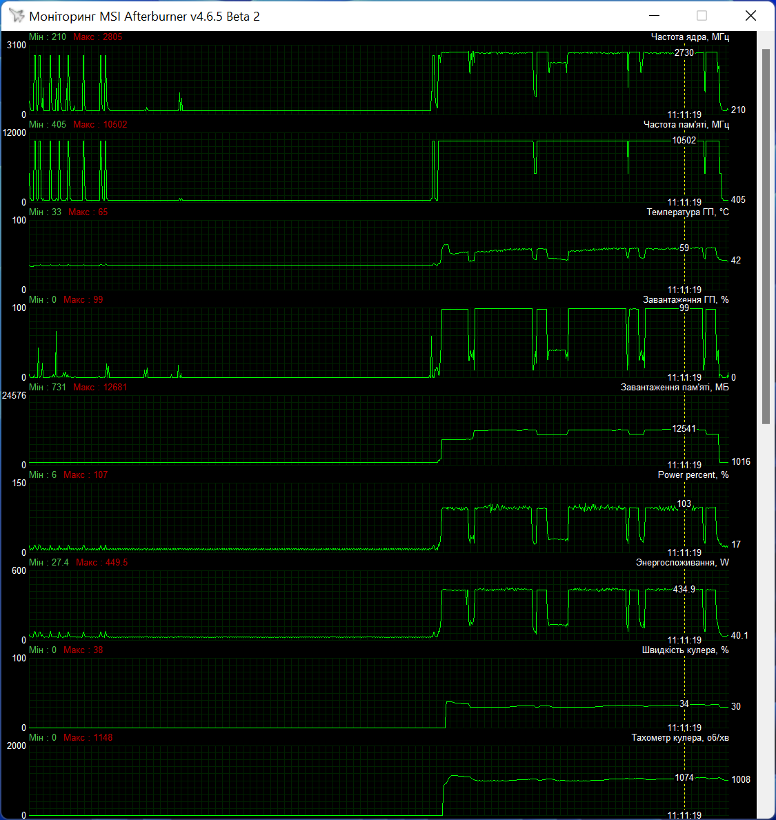Якщо дивитися на максимальні показники, то вони сягали 65 градусів для чипа (77 °C Hot Spot) та 72 градуси для пам’яті. Вентилятори на радіаторі мали швидкість 1550 об/хв, але якщо довго грати з максимальним налаштуванням графіки у важких проєктах, то можливо отримати й 1900 об/хв.