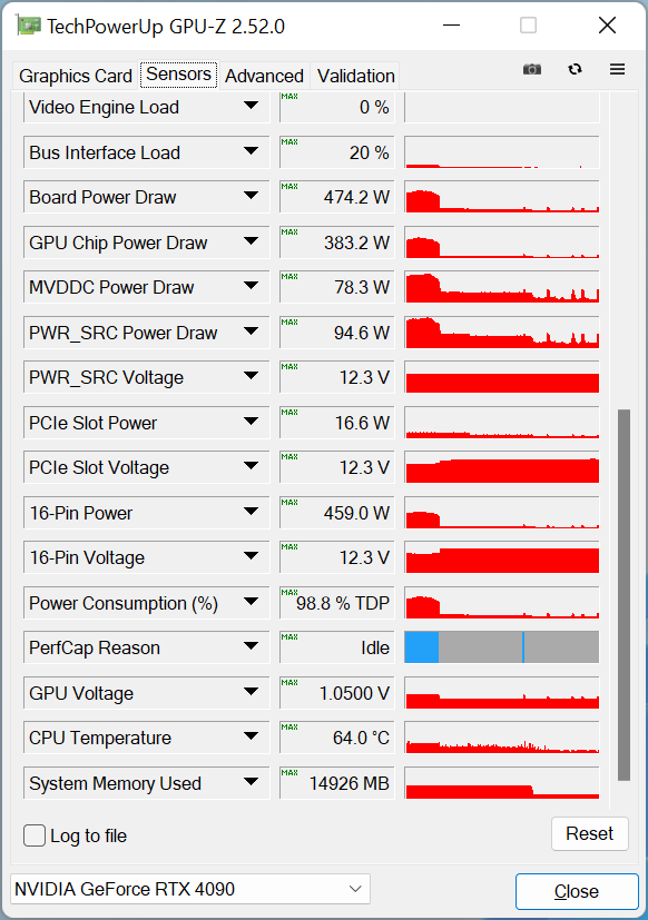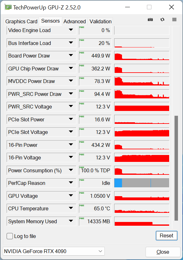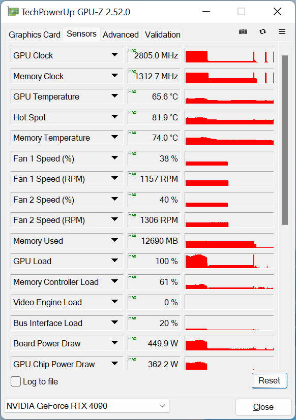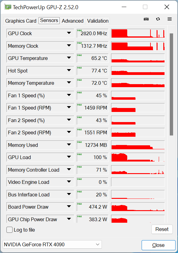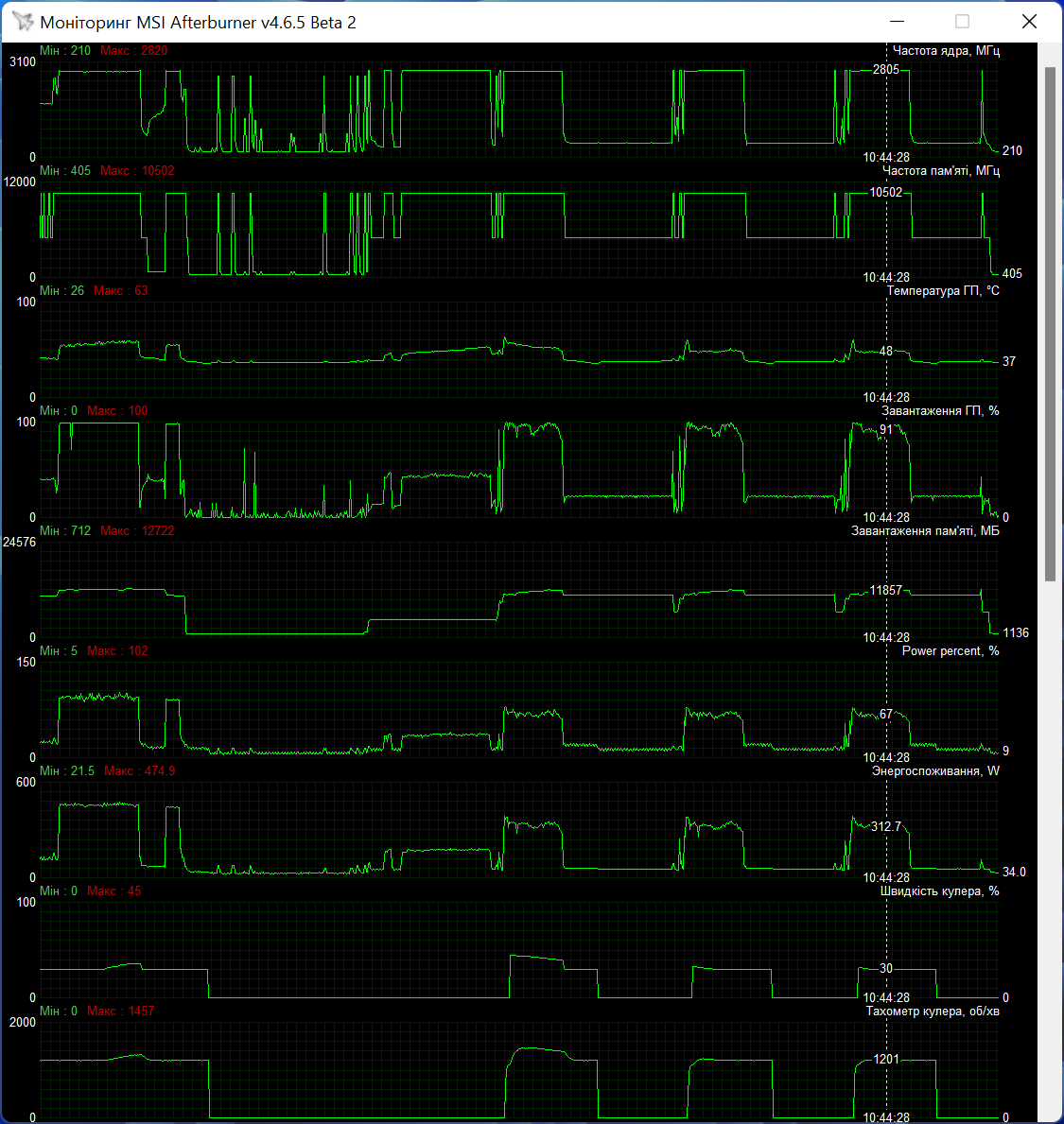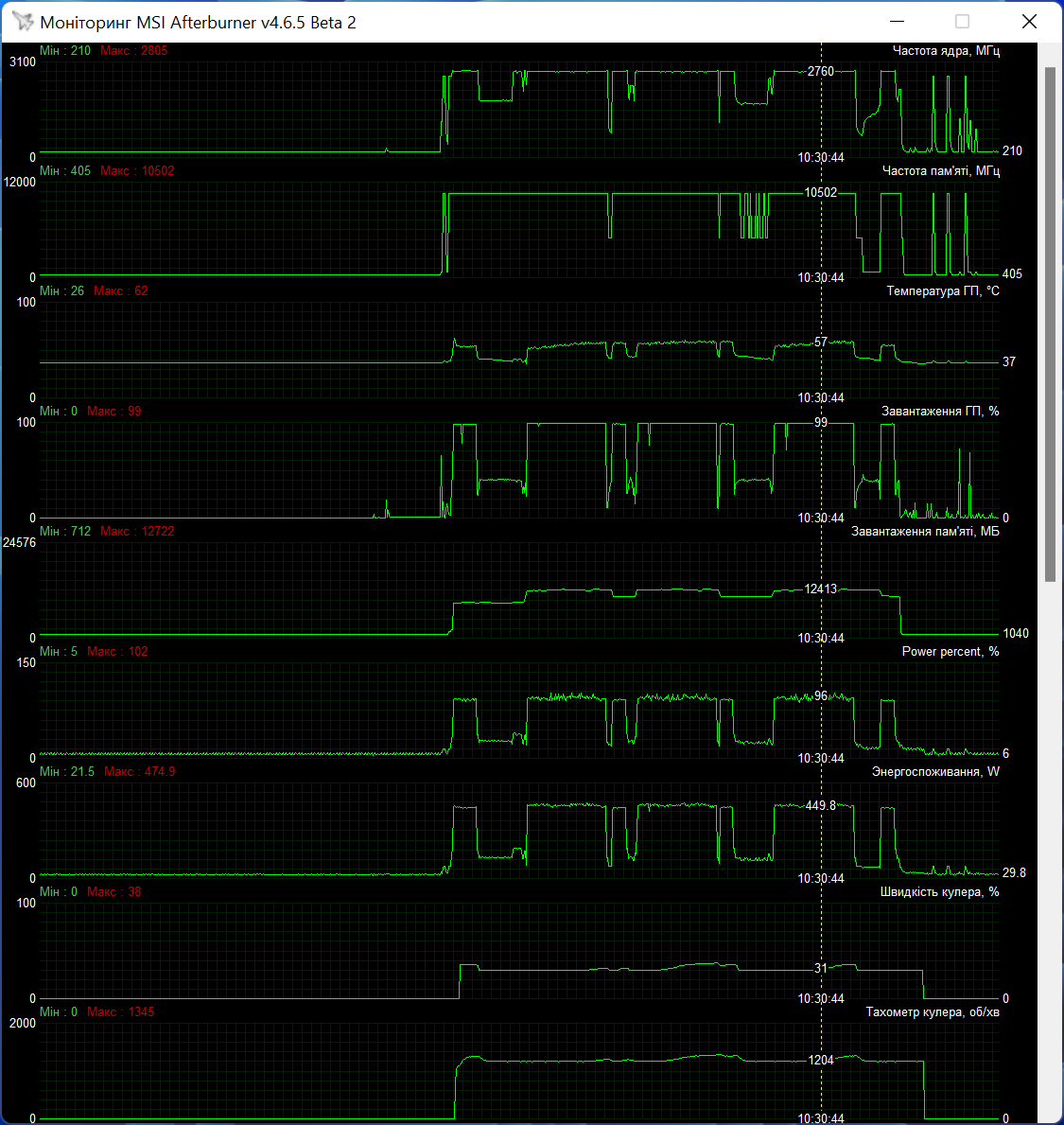 Якщо дивитися на максимальні показники, то вони сягали 65 градусів для чипа (77 °C Hot Spot) та 72 градуси для пам’яті. Вентилятори на радіаторі мали швидкість 1550 об/хв, але якщо довго грати з максимальним налаштуванням графіки у важких проєктах, то можливо отримати й 1900 об/хв.