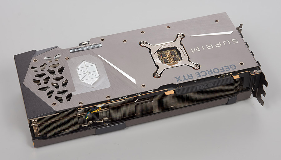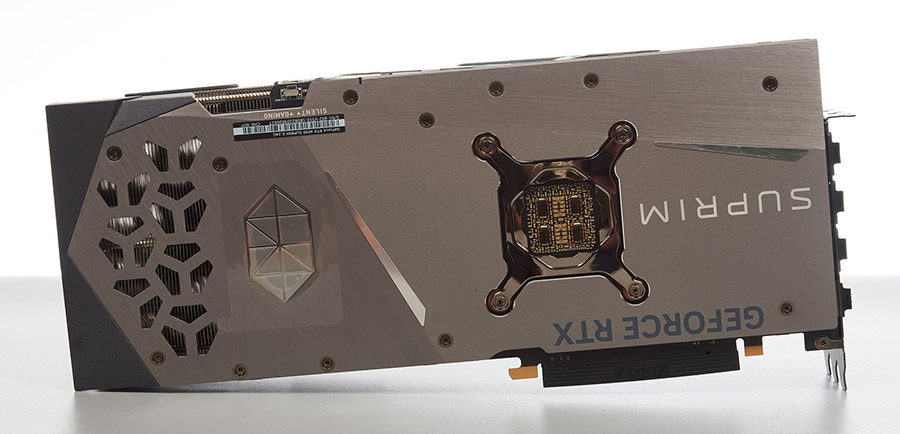 Зі шліфованого алюмінію зроблена не тільки верхня кришка, а також й пластина на задньому боці, яку доповнює пластикова вставка. Також на ній замість дракона красується гранчастий логотип серії Suprim з підсвіткою. Біля нього є також отвори для проходження повітря — у відеокарт на чипах GeForce RTX 30 такого не було і далі ми зрозуміємо, завдяки чому вони з’явилися.