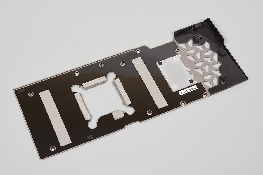 Пластина має товсті термопрокладки та використовується у процесі охолодження відеокарти, як і рамка, яка накриває частину DrMOS та дроселів з лицевої сторони.