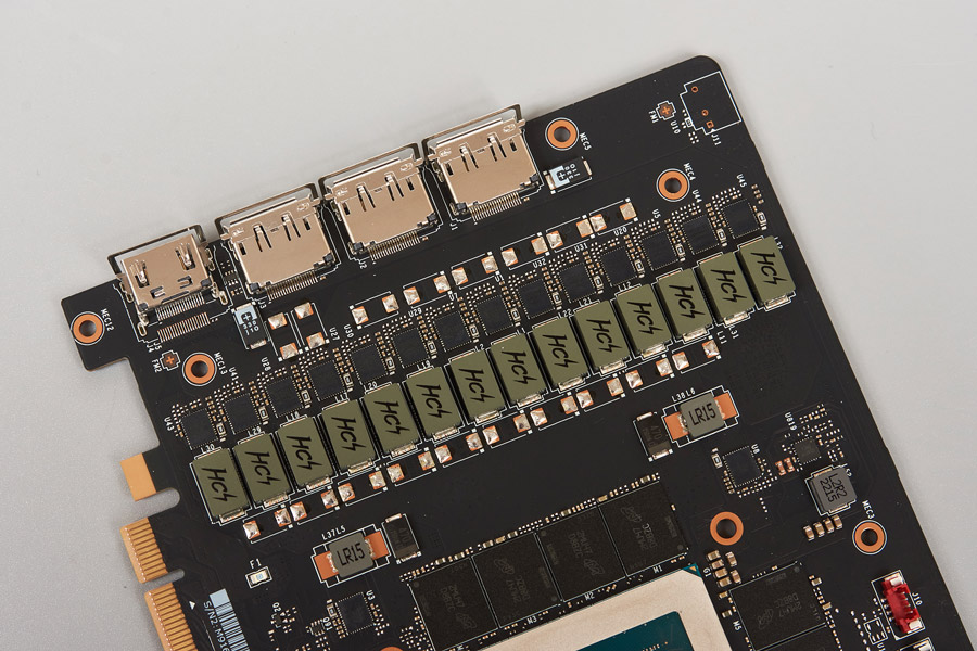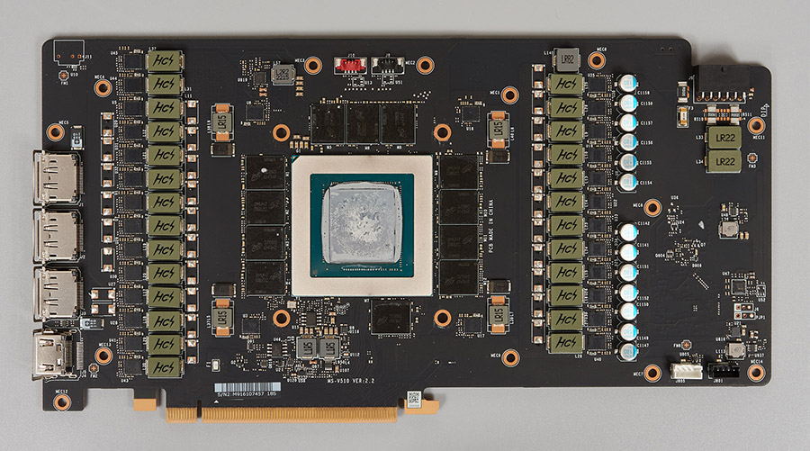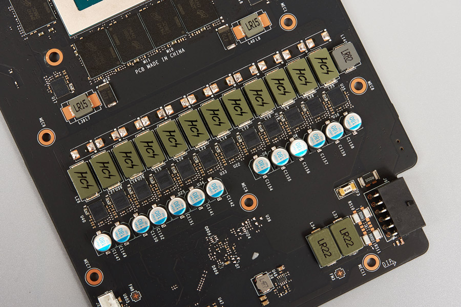 Для пам'яті використовується чотири фази живлення, для GPU — 26. Всі вони виконані з елементами MPS MP86957, кожен з яких розрахований на струм 70 А. Дроселів при навантаженні на карту майже не чути.