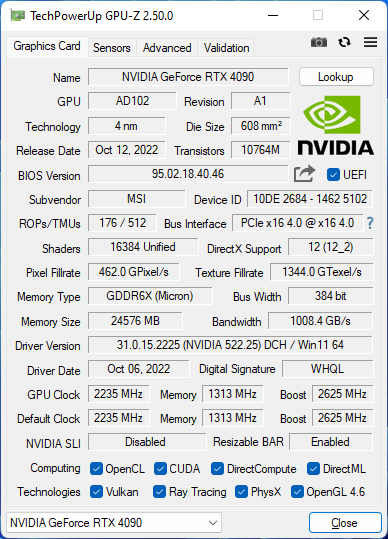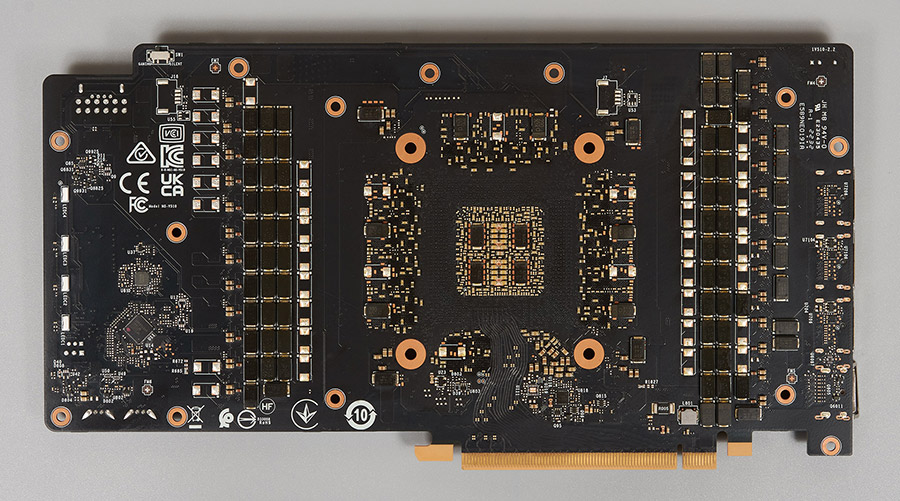 Використовується чип AD102-300-A1 із захисною рамкою, який взаємодіє через 384-бітну шину з відеобуфером на 24 ГБ, набраним з 12 мікросхем Micron 2MU47D8BZC.