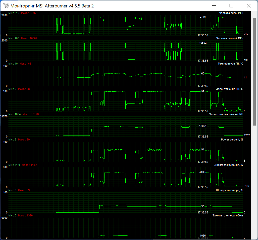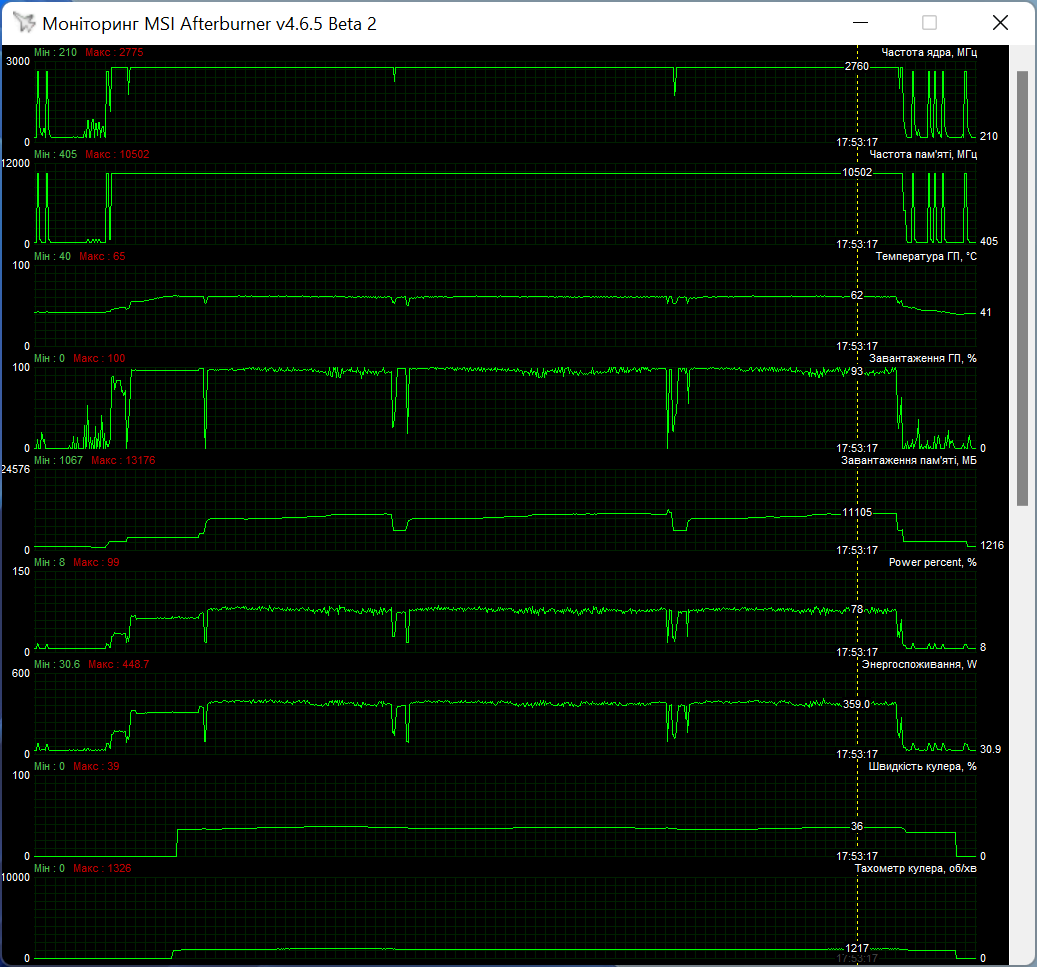 Максимальна температура, яку вдалося зафіксувати, склала 66 °C, Hot Spot був на 10 градусів вищий. Частота чипа може досягати й 2775 МГц або навіть 2790 МГц, але на загальну швидкодію вони ніяк не впливають.