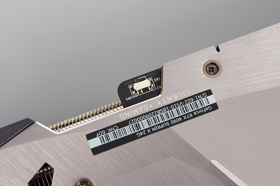 Поруч з роз’ємом живлення на зворотному боці є перемикач BIOS, який дозволяє вибрати режими Gaming або Silent, які відрізняються між собою максимальними Boost-частотами в іграх. Більше ніякої різниці між ними на відкритому стенді я не помітив. Можливо, в закритому корпусі ПК вони якось проявлять себе.