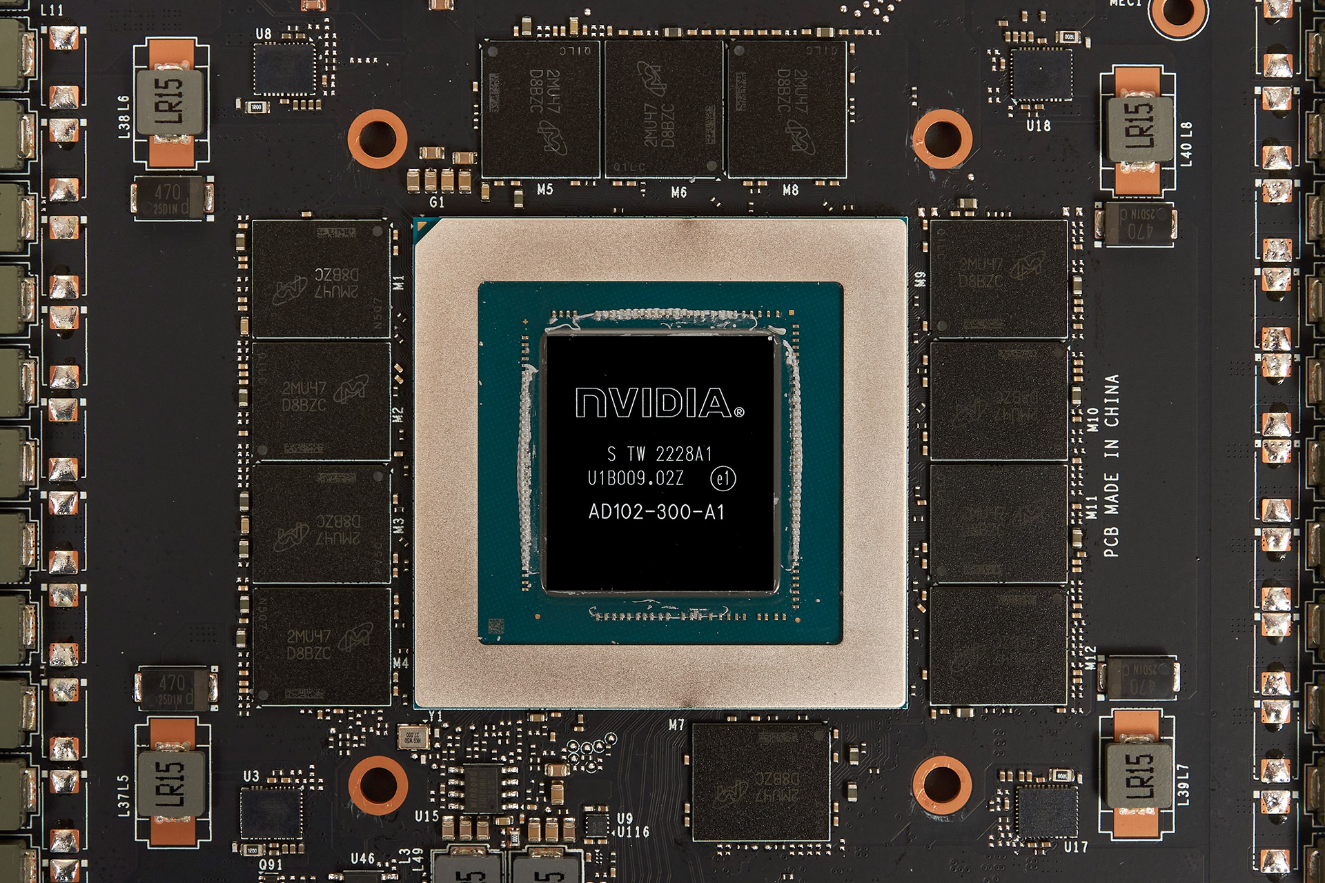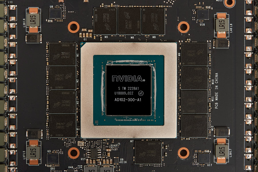 Використовується чип AD102-300-A1 із захисною рамкою, який взаємодіє через 384-бітну шину з відеобуфером на 24 ГБ, набраним з 12 мікросхем Micron 2MU47D8BZC.