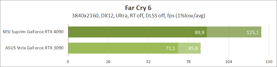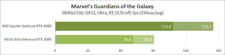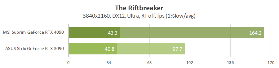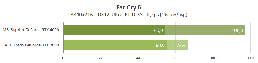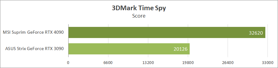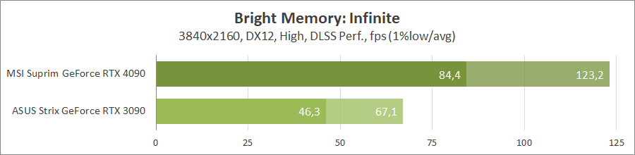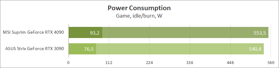 Чип працює на стандартній частоті 2235 МГц та може прискорюватися до 2625 МГц, що більше, ніж у розглянутій раніше ASUS TUF GeForce RTX 4090. А ось ліміт потужності у Suprim обмежений 520 Вт. Пам’ять функціонує зі стандартною пропускною спроможністю 21 Гбіт/с.
