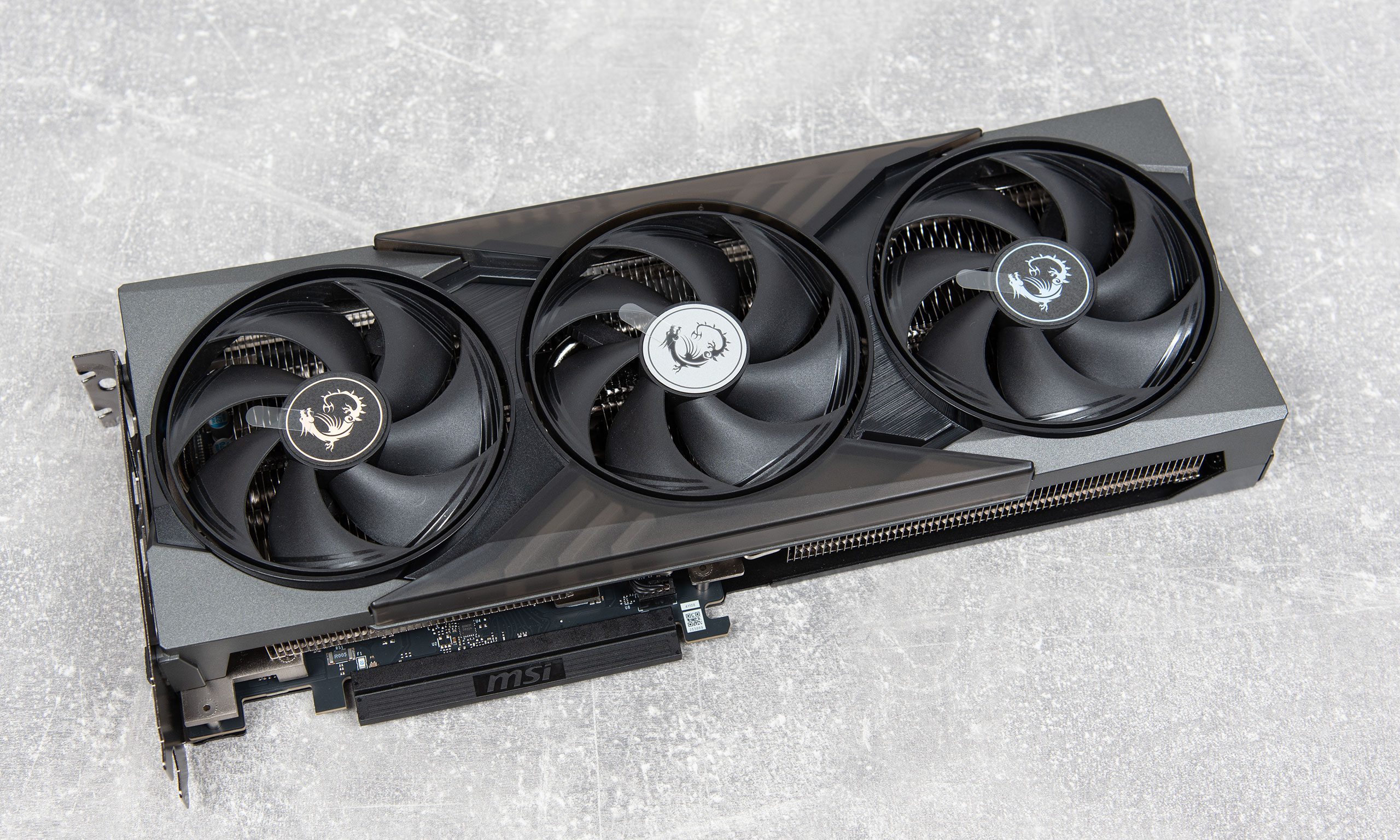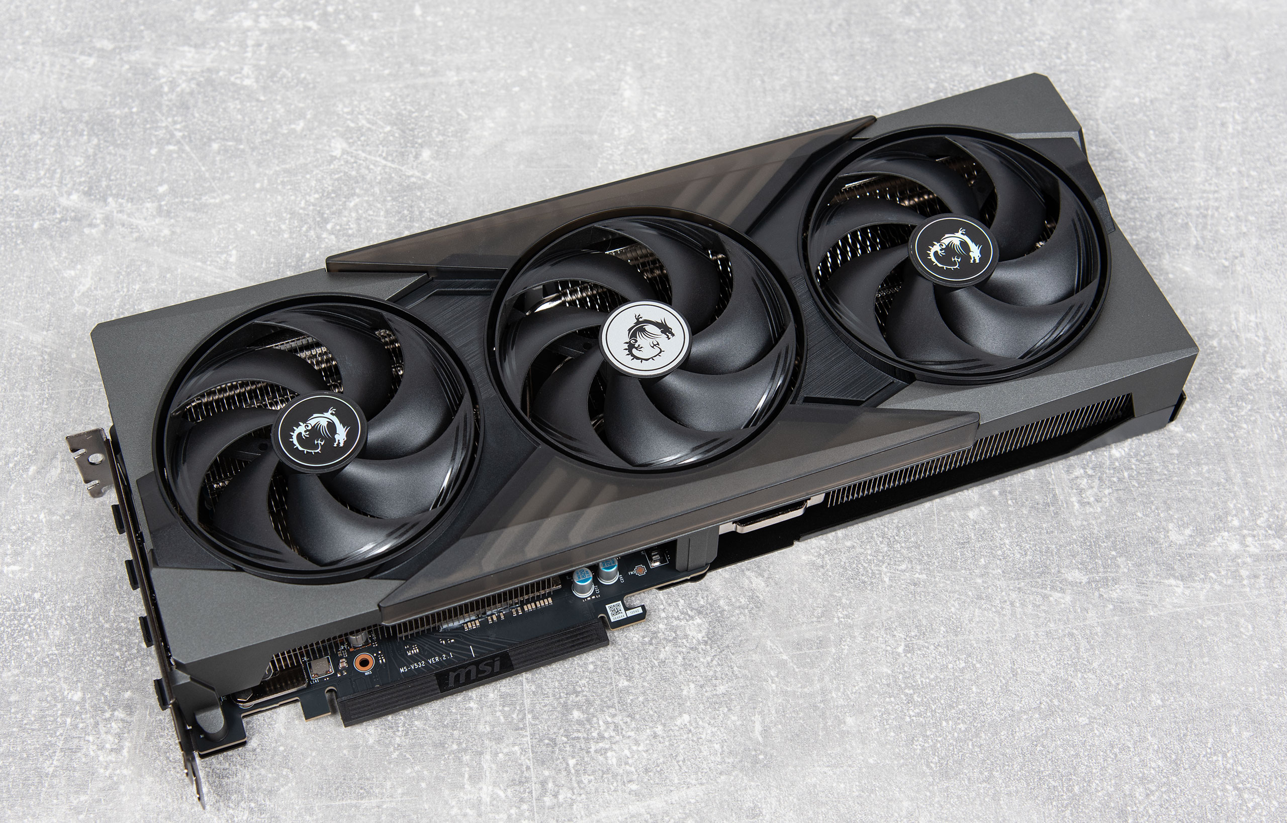 Наступний учасник вже має більші розміри — 300×125×44 мм, як й вагу в 0,85 кг, що все одно якихось особливих вимог до шасі ПК не висуває. 4608 потокових процесорів працюють на частоті 2407 МГц та можуть автоматично прискорюватися до 2647 МГц. Пам’ять GDDR7 з обсягом вже у 16 Гбайт також взаємодіє з GPU через 128-бітовий інтерфейс, але зайві мегабайти дають непогану фору відносно карт з меншим відеобуфером. Швидкодія й тут дорівнює 28000 МТ/с. Огляд карти можна знайти за цим посиланням.