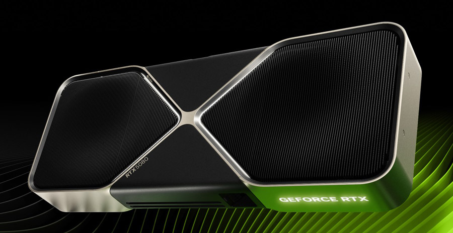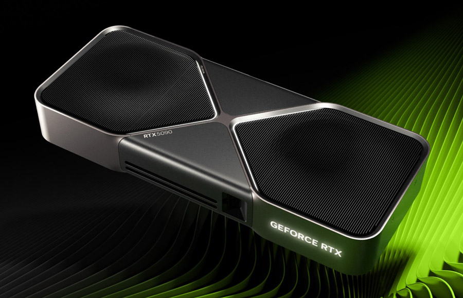 Старша відеокарта GeForce RTX 5090 виконана на базі чипа GB202 та містить 21760 потокових процесорів, що на 30 відсотків більше, ніж у попередника. Пропорційно збільшилася кількість й інших блоків. Текстурних та тензорних тепер по 680 штук, ядер прискорення трасування променів стало 170 штук, а ось кількість блоків растеризації не збільшили й вони залишилися на тому самому рівні, а саме 176 штук. Працюють всі ці блоки на частоті 2017 МГц з автоматичним прискоренням до 2407 МГц. Шину пам’яті розширили до 512 біт, а обсяг новітньої пам’яті GDDR7 довели до 32 Гбайт, що занадто навіть для роздільної здатності 4K, але актуально для роботи з ШІ-програмами. Функціонує пам’ять зі швидкістю 28 ГТ/с. Використання старого техпроцесу не сприяло економічності новим GPU, тож рівень споживання GeForce RTX 5090 доходить до 575 Вт, а в нереференсних й того більше! Ціна новинки відповідає її потужності — $1999, але карт немає навіть за ціною виробників-партнерів Nvidia, яка вище на 200–300 доларів.