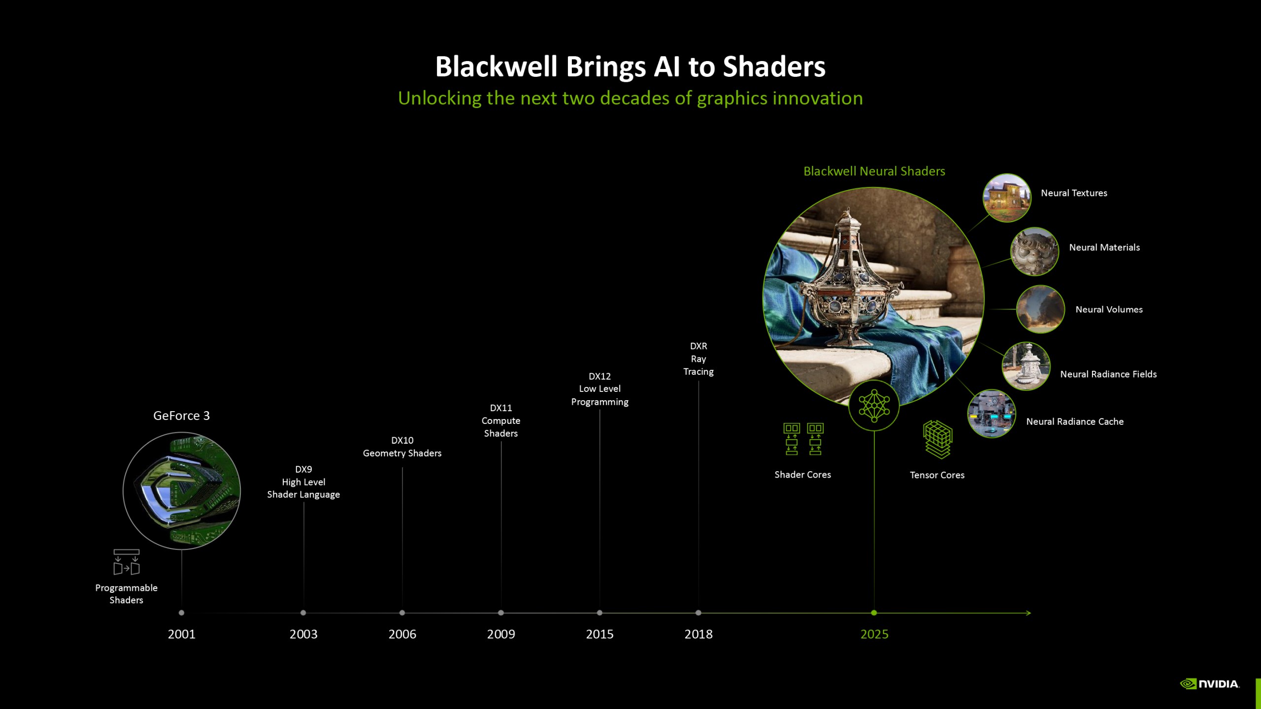 Усе це дало змогу впровадити новий тип нейронних шейдерів (RTX Neural Shaders) і цілу низку технологій із застосуванням малих нейронних мереж для оптимізації різних елементів рендерингу. RTX Mega Geometry прискорить роботу зі складною геометрією під час трасування шляху. Технології RTX Neural Texture Compression, RTX Neural Materials і RTX Neural Radiance Cache покликані забезпечити кращу якість візуалізації за кращим використання ресурсів, зокрема знижуючи завантаження відеопам’яті. Також представлено технологію RTX Neural Faces для створення реалістичних облич та інші технології, які спираються на технології ШІ.