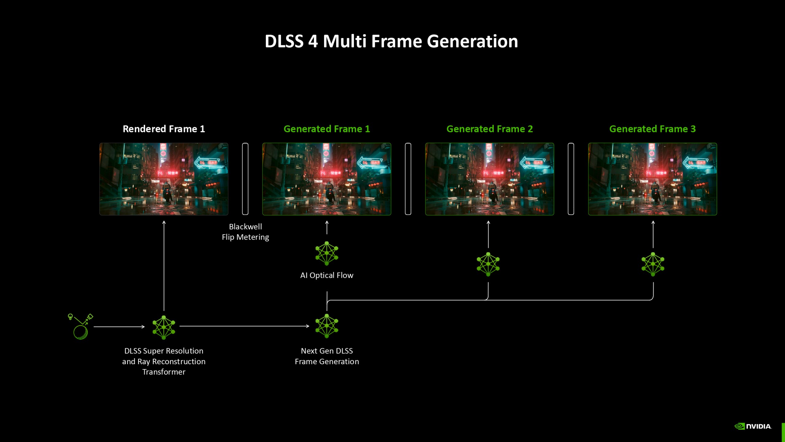 Впровадження нової моделі Transformer, посилені тензорні блоки та оновлений рушій AI Optical Flow дали змогу представити нову версію генерації кадрів, що створює до чотирьох додаткових кадрів. Це підвищує загальну продуктивність при тому ж енергоспоживанні, що у підсумку позитивно позначається на часі автономної роботи. З впровадженням Multi Frame Generation можна говорити про те, що більшу частину пікселів на екрані вже малює нейромережа.