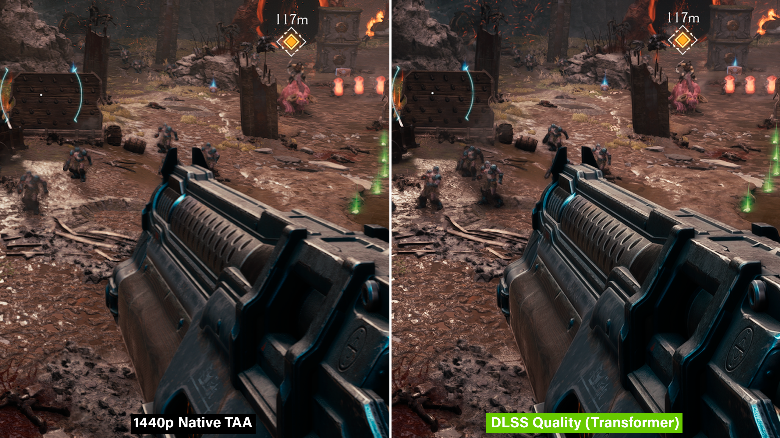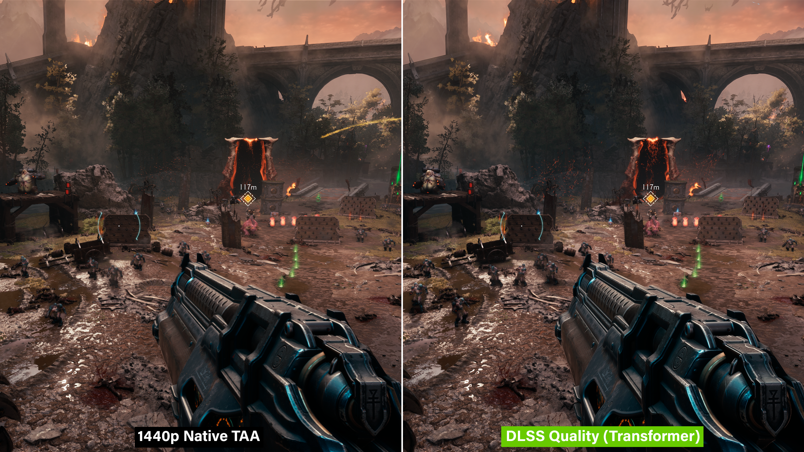 Як приклад роботи масштабування DLSS 4 Super Resolution скористаємося порівнянням із гри Doom: The Dark Ages, яке наводилося в минулих матеріалах. Нижче можна оцінити якість зображення у форматі 2560×1440 зі стандартним згладжуванням TAA та з ввімкненою технологією DLSS Quality. Другий варіант надає кращу чіткість текстур на зброї та землі, що особливо добре видно на скриншоті з дворазовим збільшенням. І одночасно з поліпшенням картинки користувач отримує помітне зростання продуктивності. Очевидно, що у швидкому режимі DLSS Performance все буде не так ідеально, але це відмінний компроміс для подвоєння частоти кадрів.
