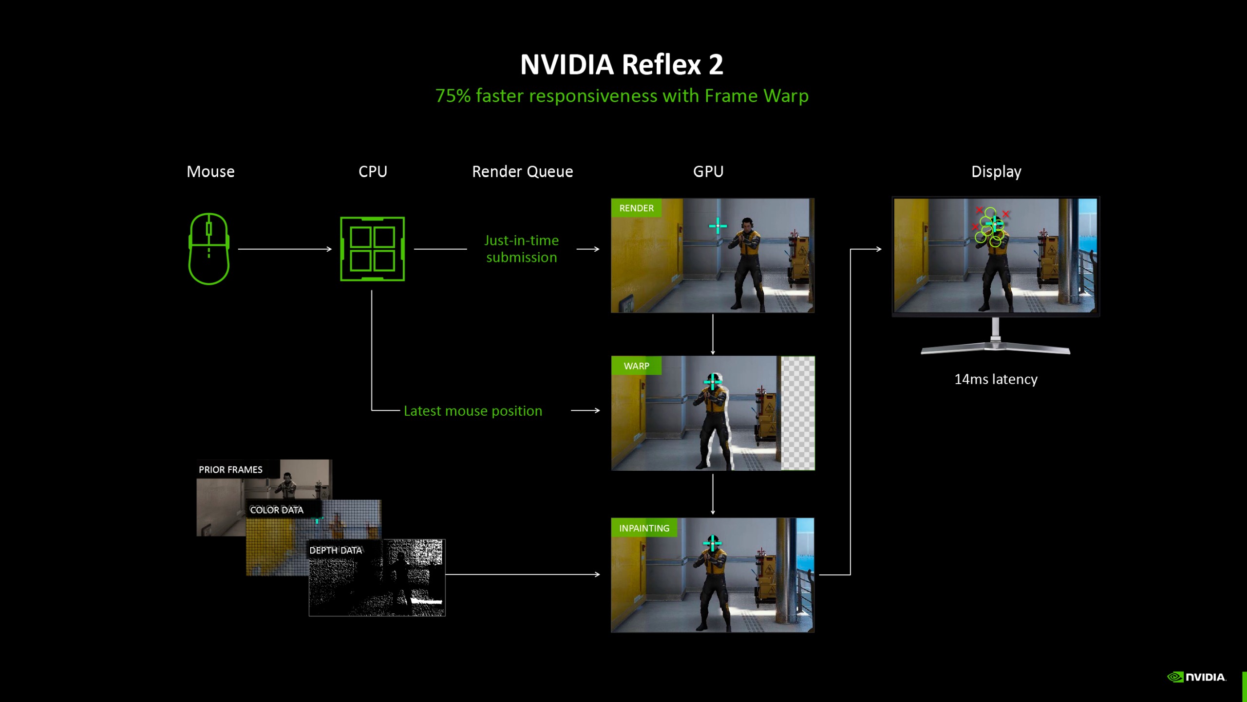 Зворотним боком генерації є збільшення затримок введення. Кадрів більше, але реакція на ваші дії швидшою не стає, що породжує певний дисонанс і не дає відчуття комфорту. Раніше це компенсувала технологія NVIDIA Reflex, яка знижувала затримки завдяки оптимізації конвеєра CPU-GPU. Тепер доступна технологія NVIDIA Reflex 2, яка йде далі й дає змогу враховувати зміщення об’єктів ще до повного відтворення кадру. Для цього знадобилося ввести «прогностичний рендеринг» (Predictive Rendering) із заповненням порожніх областей даними сусідніх кадрів. Але в підсумку гравці отримують не тільки високий фреймрейт, а й гідну реакцію на свої дії.