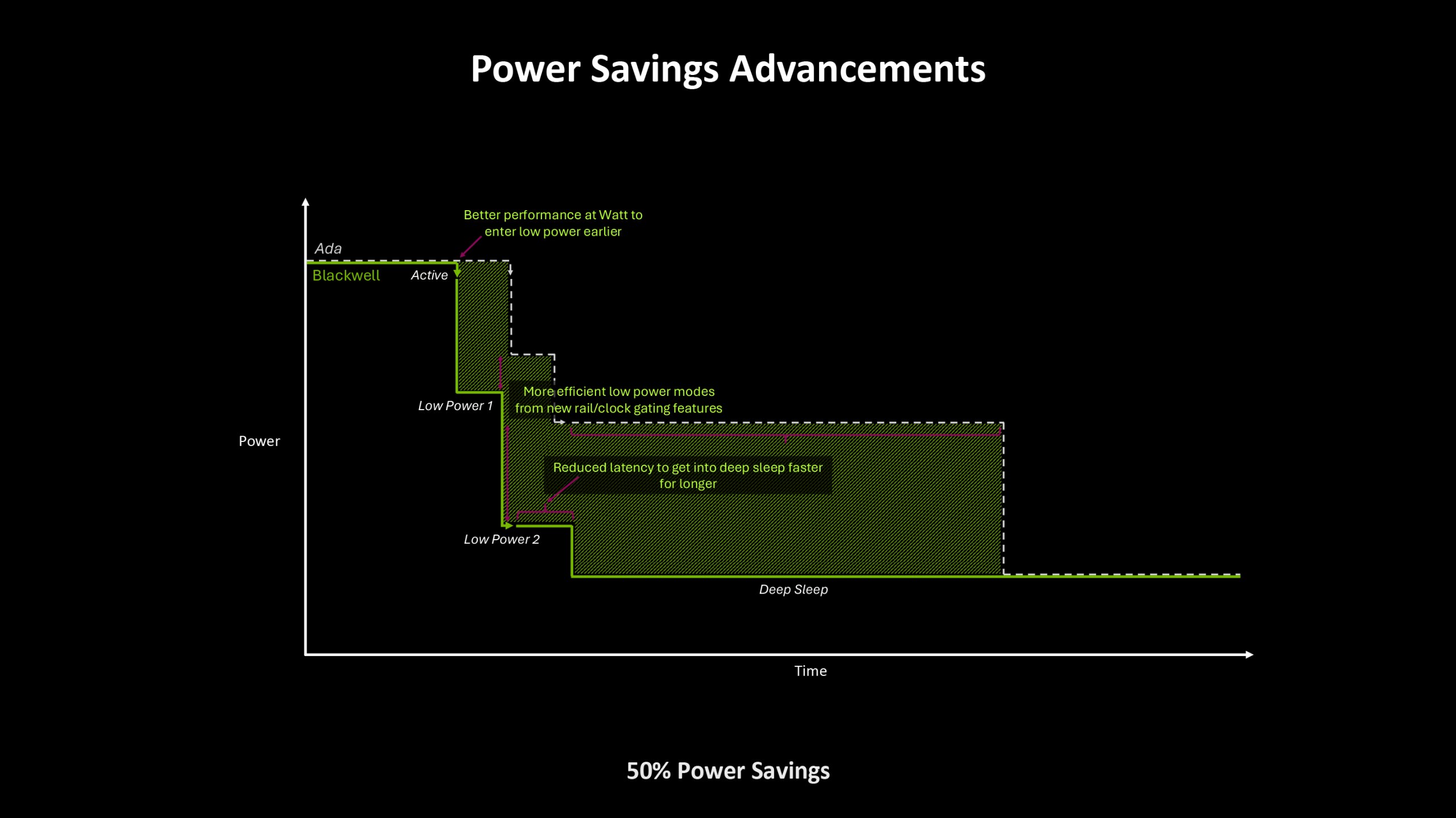 Blackwell пропонує серйозні апаратні зміни в управлінні живленням, даючи змогу більш тонко і швидко керувати напругою на різних блоках GPU. Також реалізовано гнучкі механізми окремого керування живленням графічного чипа і пам’яті GDDR7. Прискорено час перемикання між різними станами GPU. Це дає змогу економити енергію з неповним завантаженням чипа або за короткочасних навантажень. Нові GPU швидше переходять в економний режим, час активації режиму глибокого сну відбувається в 10 разів швидше відносно минулого покоління. І це теж допомагає знизити загальне енергоспоживання ноутбука.