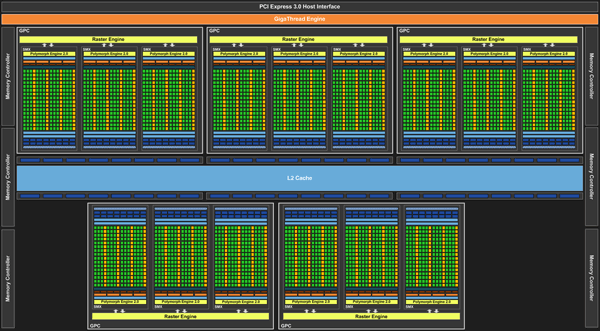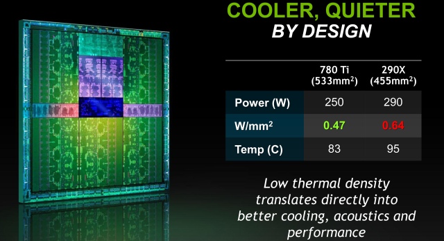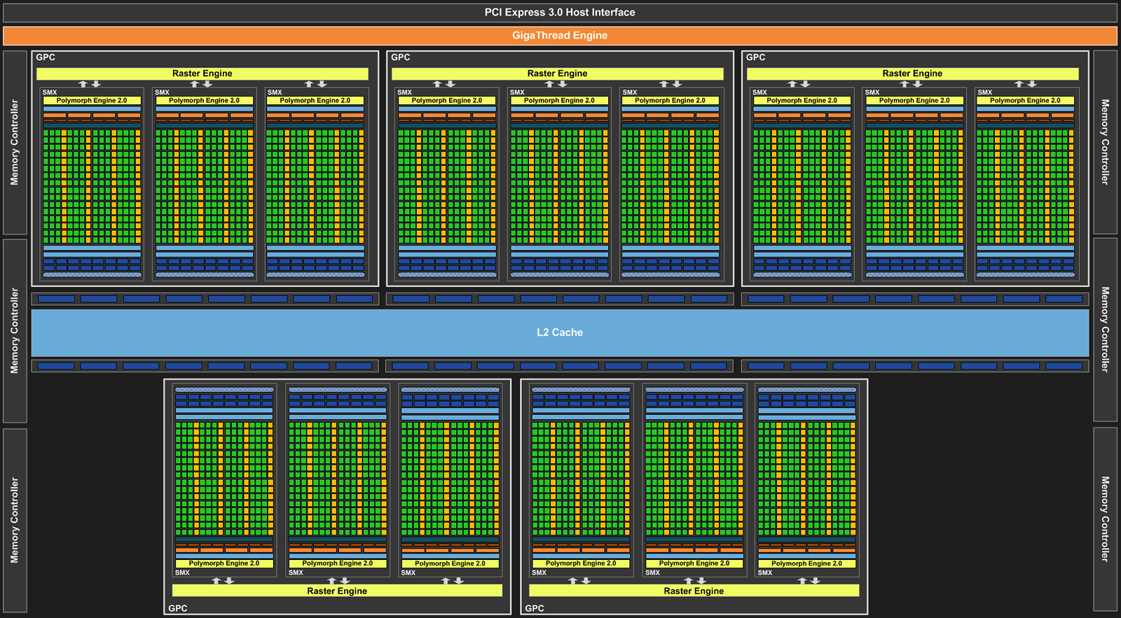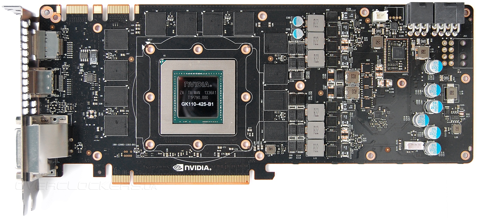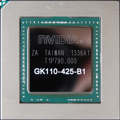 В активе процессора пять процессорных кластеров GPC, в каждом по три мультипроцессорных блока SMX. У GK104, на котором базировался старый флагман GeForce GTX 680, только четыре GPC по два SMX. Общее количество потоковых процессоров 2880, текстурных блоков — 240, блоков ROP — 48. У GeForce GTX Titan соотношение вычислительных блоков 2688/224/48, а у GeForce GTX 780 2304/192/48. Шина памяти имеет разрядность 384 бита. Но благодаря повышению рабочей частоты микросхем GDDR5 до 7000 МГц итоговая пропускная способность памяти в сравнении с Radeon R9 290X выше на 5%.