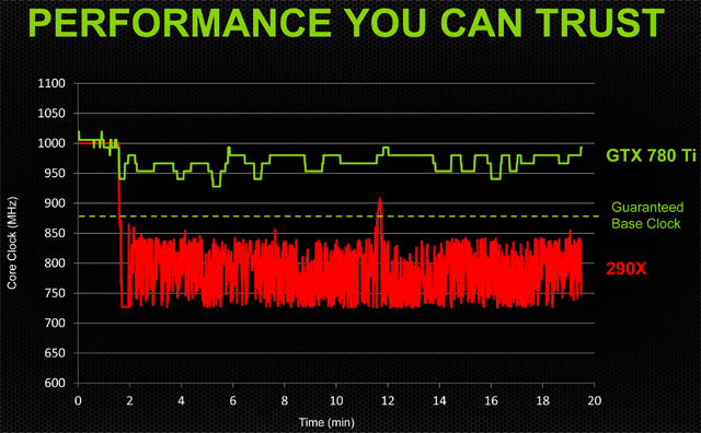 Семисотая серия GeForce поддерживает GPU Boost 2.0, в котором приоритет с ограничений по мощности сместился на ограничения по температуре. При этом все новые карты имеют довольно неплохой запас по мощности, что при должном охлаждении обеспечивало стабильное функционирование на высоких частотах Boost. У новичка temperature target повышен с 81 °С до 82 °С, как у Titan. При этом приоритет снова сменился на power target (если верить MSI Afterburner), что обеспечивает более плавное переключение и некую инерционность при высоком нагреве. Ну и в целом заметно, что алгоритм Boost более агрессивен. В итоге ядро карты удерживается в рамках 83 °С, а рабочие частоты почти всегда превышают заявленный Boost Clock. GeForce 780 в аналогичных тестовых условиях более охотно сбрасывает частоту до Boost Clock и ниже.