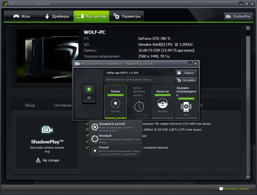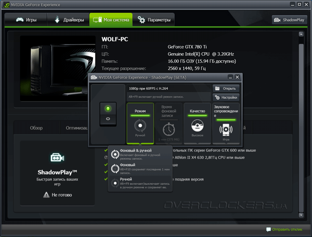 Много внимания со стороны компании уделяется развитию программного центра GeForce Experience, который обеспечивает автоматическую настройку графики в игровых приложениях с балансом между качеством и производительностью. Функция полезная для игроков, не разбирающихся в нюансах графических настроек. С недавних пор в пакет GeForce Experience добавлено приложение ShadowPlay, которое позволяет записывать игровой процесс. Это может осуществляться как фоновом, так и в ручном режиме по нажатию горячей клавиши. Запись идет в формате .mp4 с кодированием видео силами GPU. При этом падение производительности минимально и почти не ощущается на общем фоне. Размер файлов небольшой, качество довольно высокое, без артефактов в динамических сценах. Без проблем работает запись в 64-битных приложениях, чего нет у MSI Afterburner. Вот, к примеру, видеозапись нашего теста производительности в Battlefield 4, осуществленная при помощи NVIDIA ShadowPlay.