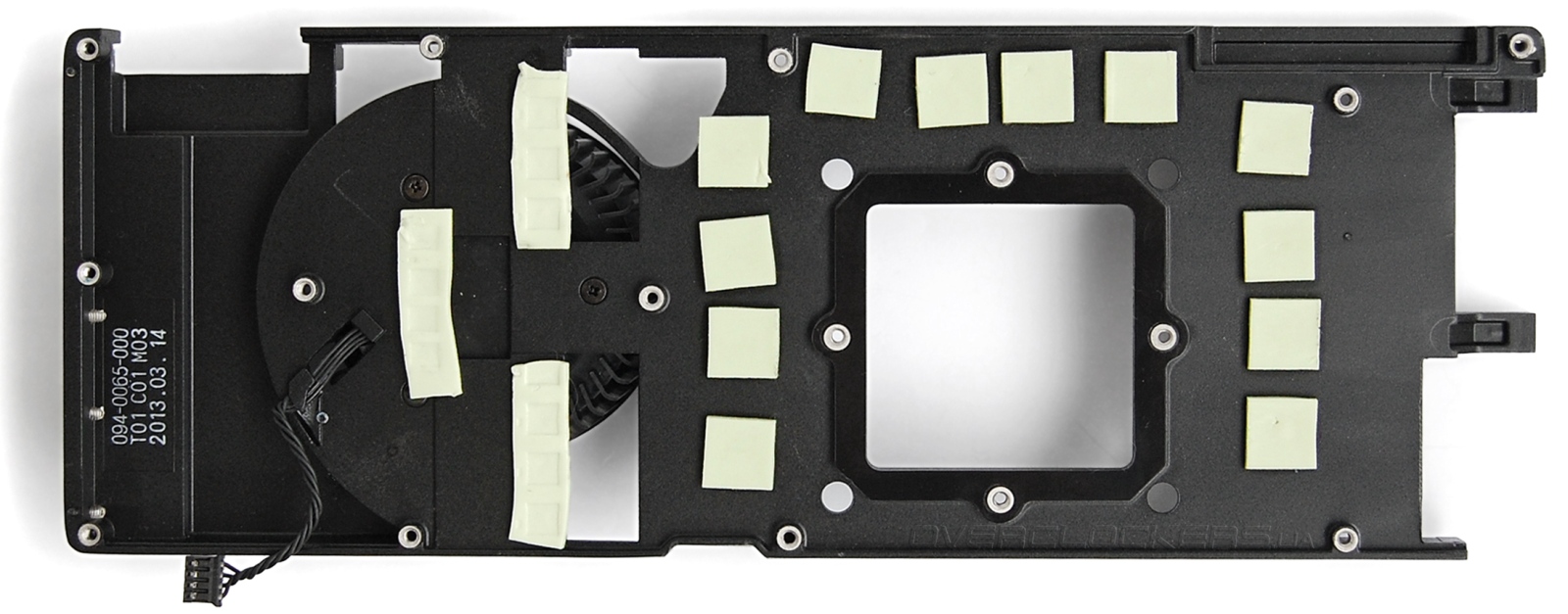 Изменений в конструкции системы охлаждения нет. Графический процессор накрыт крупным радиатором, который контактирует с поверхностью кристалла через окошко в основании кулера. Справа от вентилятора расположена дополнительная секция радиатора, призванная улучшить охлаждения VRM.