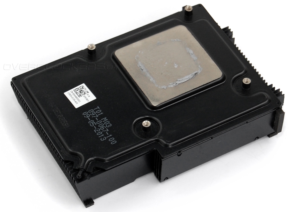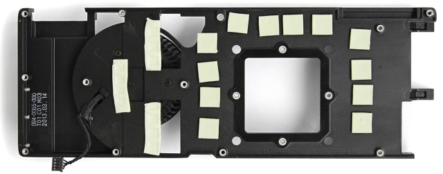Основание контактирует с силовыми компонентами и микросхемами памяти через мягкие термопрокладки, обеспечивая тем самым отвод тепла от всех элементов на плате.