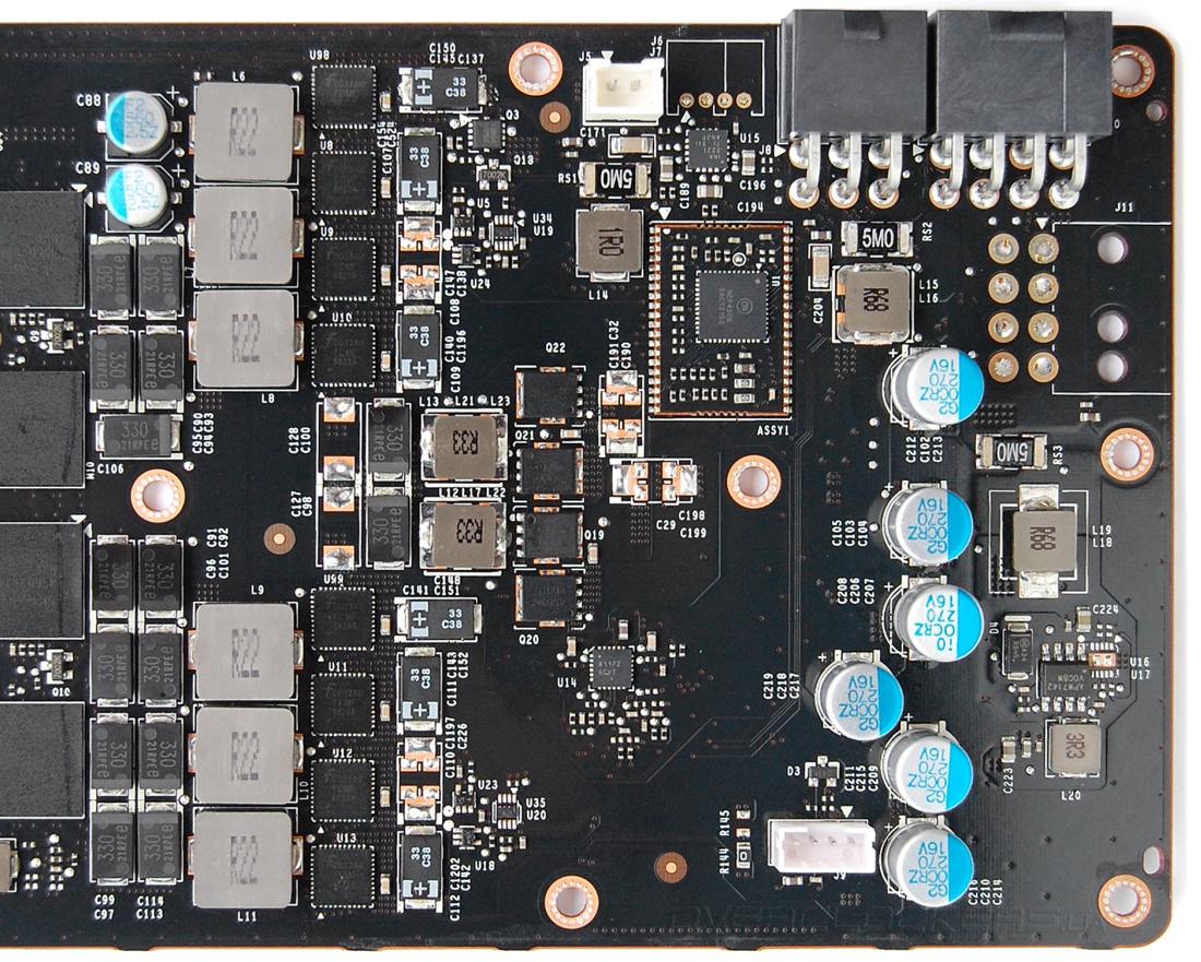 Процессор запитан от шестифазного преобразователя напряжения под управлением стандартного контроллера NCP4206. Тем не менее, программная регулировка напряжения в утилитах пока не работает. В MSI Afterburner не работает даже мониторинг напряжения. В EVGA Precision с этим проблем нет. Последняя утилита даже позволяет поднимать напряжение, но судя по нашим экспериментам, на аппаратном уровне реальных изменений не происходит.