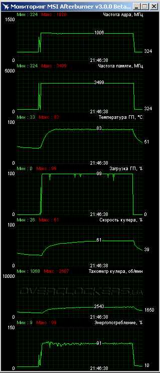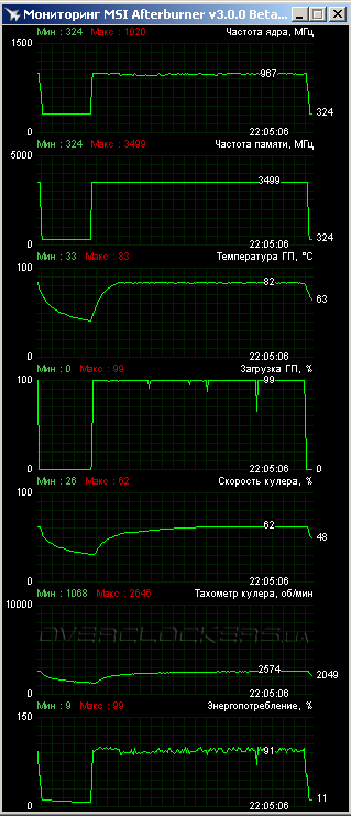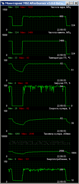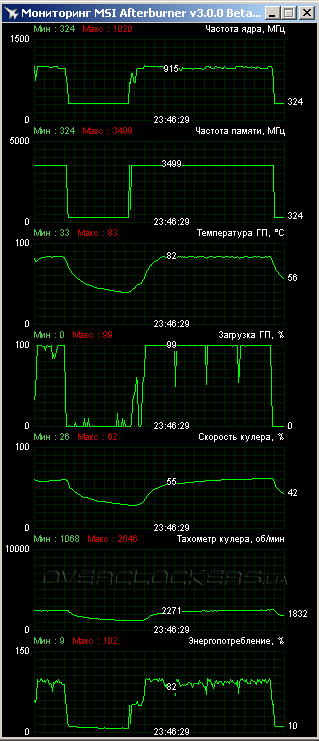 В Crysis: Warhead почти все время в течении 12-минутного теста GPU работал на частоте 1006 МГц. В начале теста, пока не прогрелось ядро, наблюдалось и более высокое значение частоты. Была пара кратковременных снижений частоты до 980 МГц. В Unigine Valley benchmark ядро работало в диапазоне 967–980 МГц. Пиковая температура в обоих тестах не превысила 83 °C, вентилятор раскручивался до 2500–2600 об/мин. Уровень шума можно назвать средним.