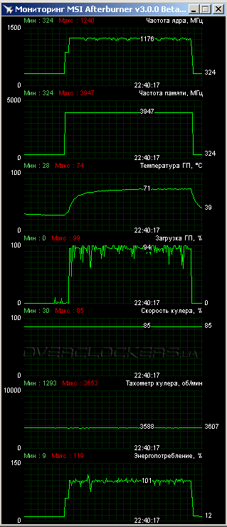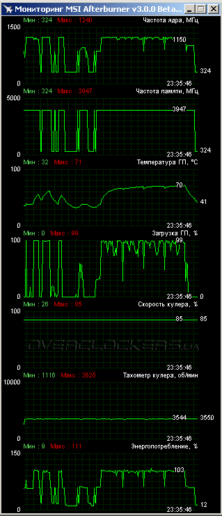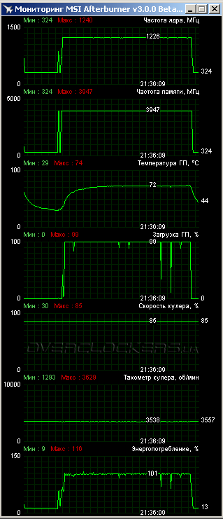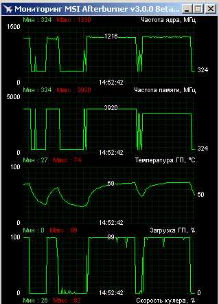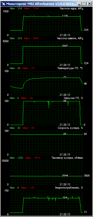 В Crysis реальная частота ядра Boost составила 1226 МГц с периодическими просадками до 1213 МГц и повышениями до 1240 МГц. В Valley benchmark основной рабочий диапазон частот равнялся 1176–1187 МГц, с просадками до 1150 МГц.