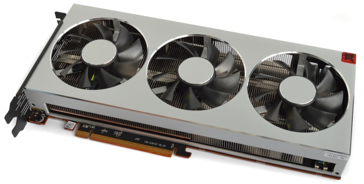 Первая видеокарта на базе 7-нм техпроцесса. В основе данной модели обновленный чип Vega 20, у которого активно 3840 потоковых процессоров и 256 текстурных блоков. Относительно старого поколения серьезно повышены частоты: базовое значения ядра составляют 1400 МГц при Boost 1750 МГц. Память HBM2 объемом 16 ГБ работает через шину разрядностью 4096 бит с эффективной частотой 2000 МГц.