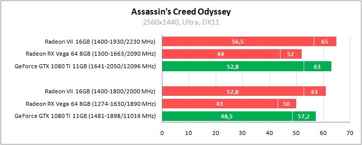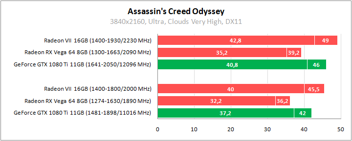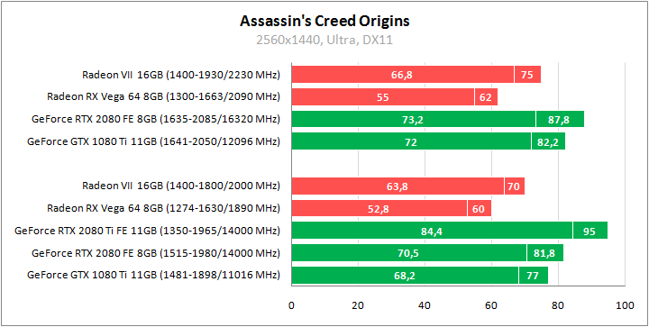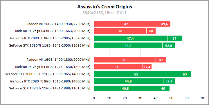 В Origins более мощные позиции у решений NVIDIA, и Radeon VII немного уступает GeForce GTX 1080 Ti. В высоком разрешении 4K преимущество над Radeon RX Vega 64 достигает 25–27%.