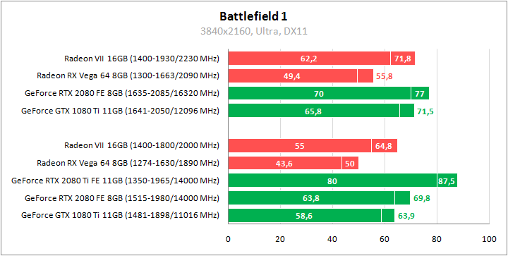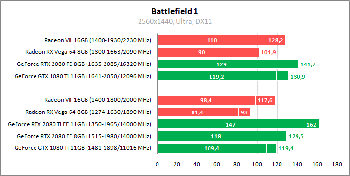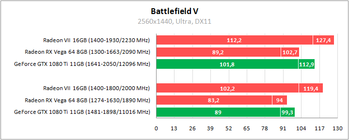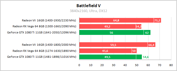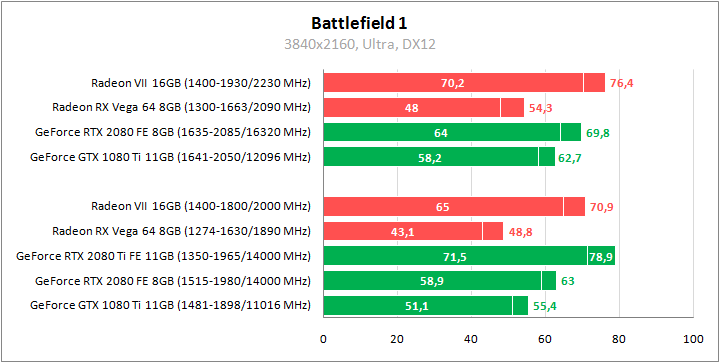 В новом Battlefield у Radeon VII серьезное преимущество относительно Radeon RX Vega 64 и отрыв от старого представителя AMD на уровне 23–30%. Разгон придает дополнительное ускорение 8–10%.