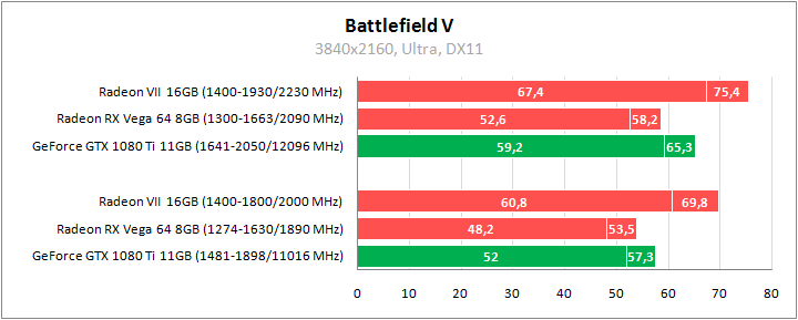В данном тесте разница между решениями AMD лишь 21%. Radeon VII проигрывает GeForce GTX 1080 Ti до 6%, а с GeForce RTX 2080 Founders Edition разница почти 20%.