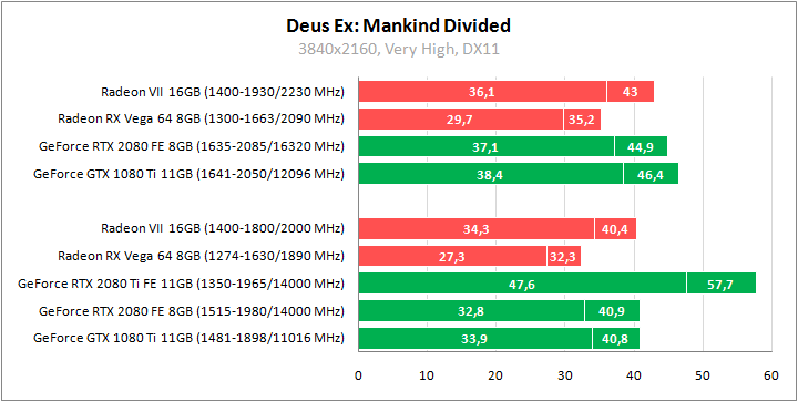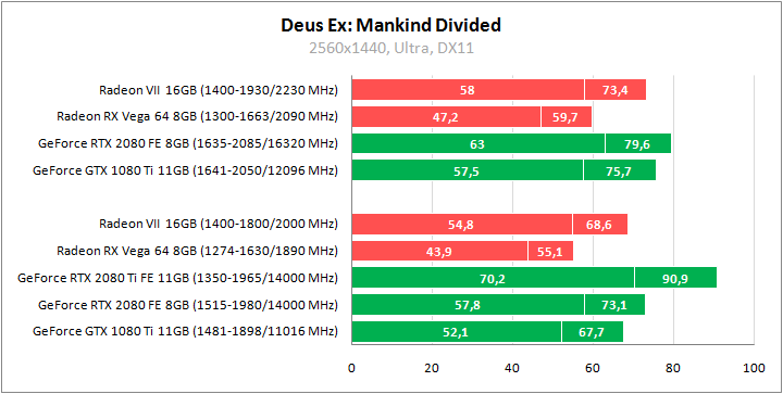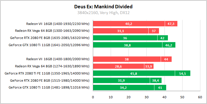 Radeon VII быстрее предшественника на 25% в Mankind Divided. В более низком разрешении он идет наравне с GeForce GTX 1080 Ti, а в 4K наравне и с GeForce RTX 2080.