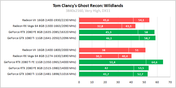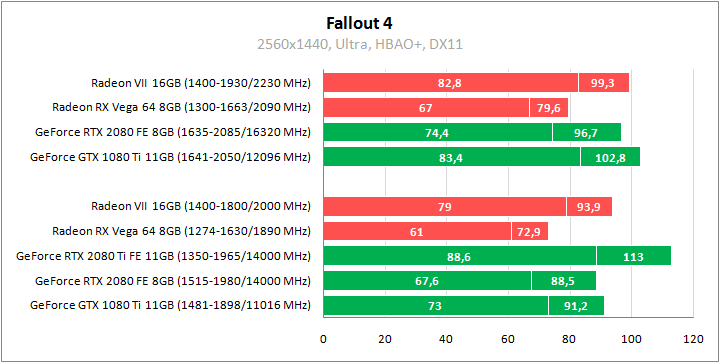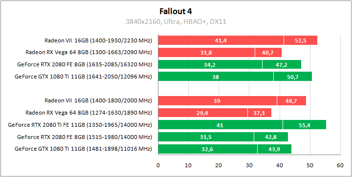Radeon VII обходит GeForce GTX 1080 Ti и GeForce RTX 2080 в Fallout 4, и наибольший отрыв в высоком разрешении 4K. Разница с Radeon RX Vega 64 достигает 29–31%. После разгона в 4K удается вплотную подойти к GeForce RTX 2080 Ti.