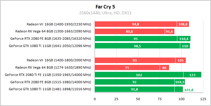 В обоих разрешениях Far Cry 5 герой обзора немного обходит GeForce RTX 2080. Разница с самым простым видеоадаптером (не Founders Edition) могла быть еще на пару процентов выше. Разгон обеспечивает ускорение до 8%.