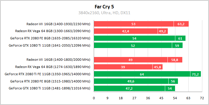 Radeon VII быстрее Radeon RX Vega 64 на 23–26%, немного уступая конкурентам NVIDIA. Разница с последними наименее заметна в разрешении 4K.