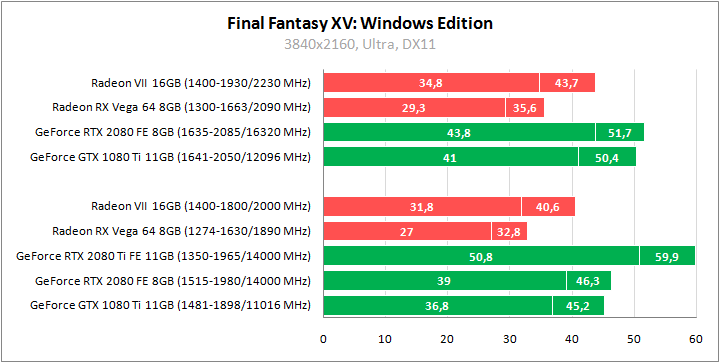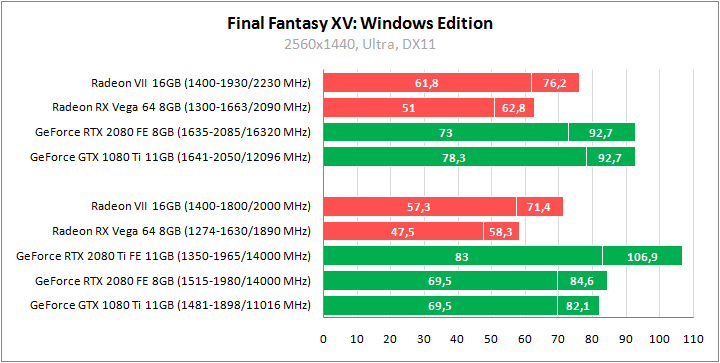В Final Fantasy разница между Radeon VII и Radeon RX Vega 64 на уровне 18–23%. Такого ускорения мало, чтобы соперничать с представителями NVIDIA. В данной игре GeForce GTX 1080 Ti и GeForce RTX 2080 показывают лучшие результаты.