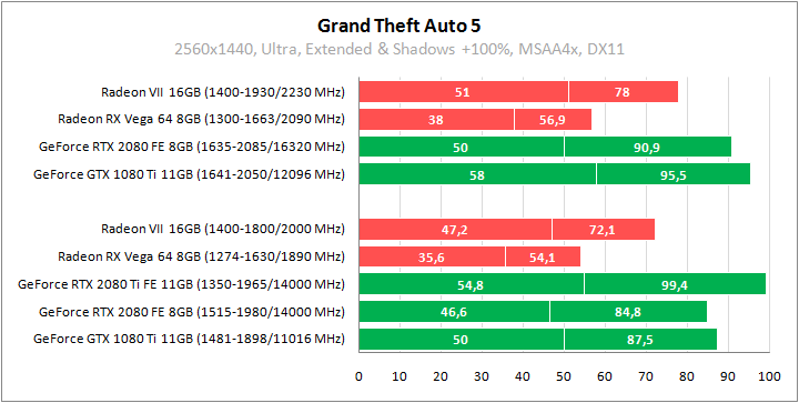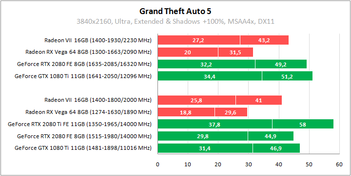 Radeon VII проигрывает конкурентам зеленого лагеря и в GTA 5, хотя по минимальному fps разница минимальная. Разрыв с предшественником огромный — старый Radeon RX Vega 64 уступает новичку 33–38%.