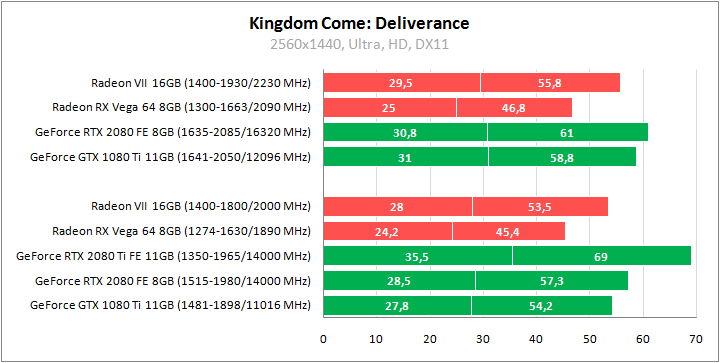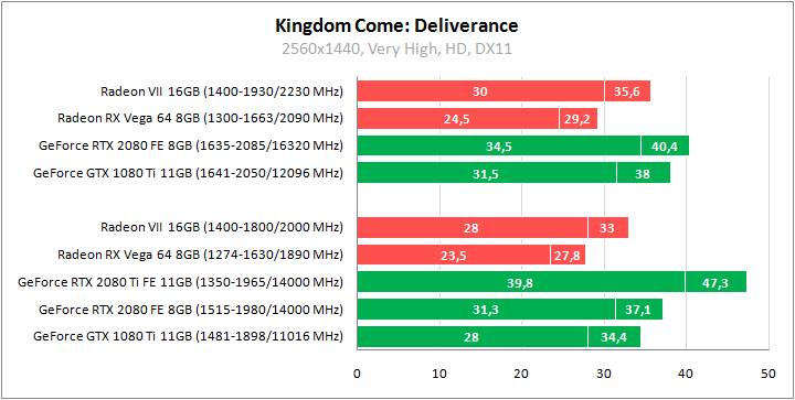 В Kingdom Come Radeon VII быстрее предшественника на 16–19%. Минимальное отставание от GeForce GTX 1080 Ti и более заметное относительно GeForce RTX 2080.