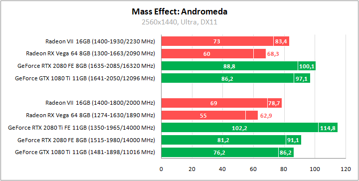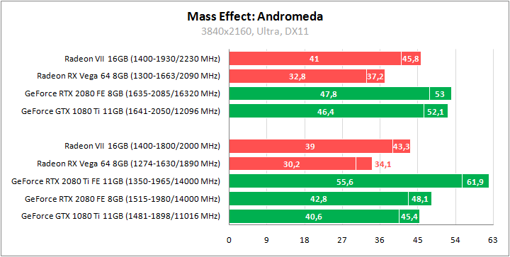 В Andromeda новичок AMD показывает отрыв от старого Radeon на уровне 26–29%, но все равно проигрывает конкурентам от NVIDIA. В 4K отставание чуть меньше, и разогнанный Radeon VII выходит на уровень GeForce GTX 1080 Ti.