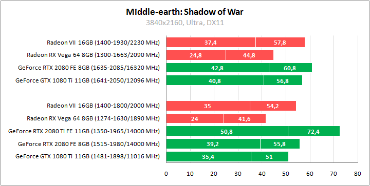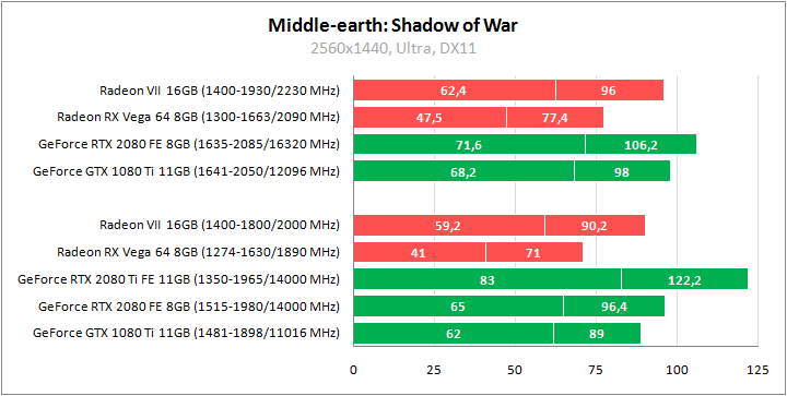 Radeon VII немного выигрывает у GeForce GTX 1080 Ti по среднему fps в Shadow of War, хотя по минимальному ситуация противоположная. GeForce RTX 2080 показывает небольшое преимущество в номинале и в разгоне.