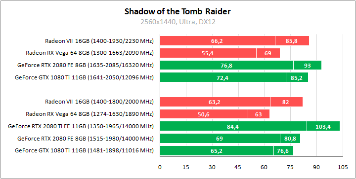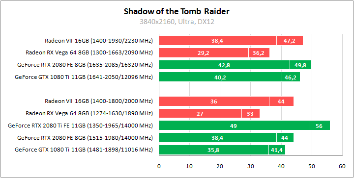 В Tomb Raider рассматриваемый Radeon VII уступает GeForce RTX 2080 Founders Edition только по минимальному fps. При сравнении с самым простым представителем серии RTX 2080 эта разница могла бы полностью исчезнуть. Так что тут мы видим равнозначные решения.