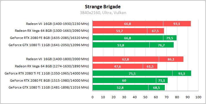 В меньшем разрешении Strange Brigade можно говорить о том, что Radeon VII идет наравне с ближайшими конкурентами. Но в 4K флагман AMD не только уверенно обходит GeForce RTX 2080, но и начинает приближаться к GeForce RTX 2080 Ti, сводя к минимуму отставание от лидера за счет своего разгона.