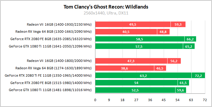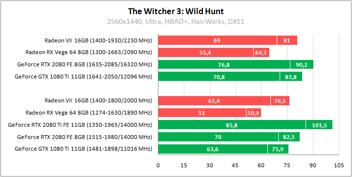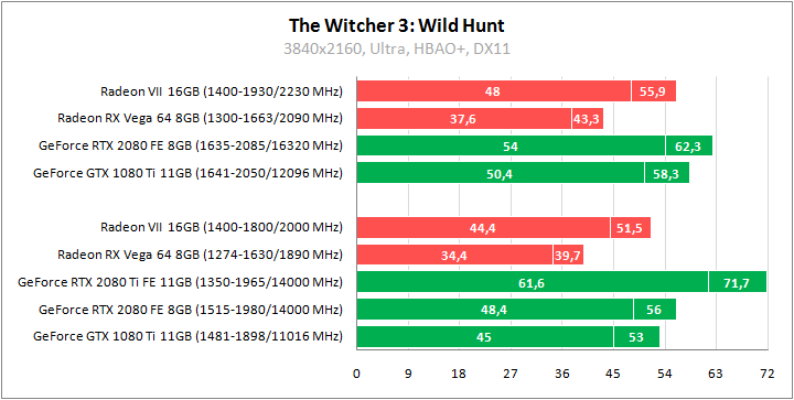 В Witcher 3 при разрешении 2560x1440 герой обзора показывает результат между GeForce GTX 1080 Ti и GeForce RTX 2080, но в 4K немного уступает GeForce GTX 1080 Ti. В первом режиме задействована технология HairWorks, и вероятно самый тяжелый режим снижает преимущества решений NVIDIA. Отрыв Radeon VII от предшественника достигает 27–29%. Ускорение от разгона до 8%.