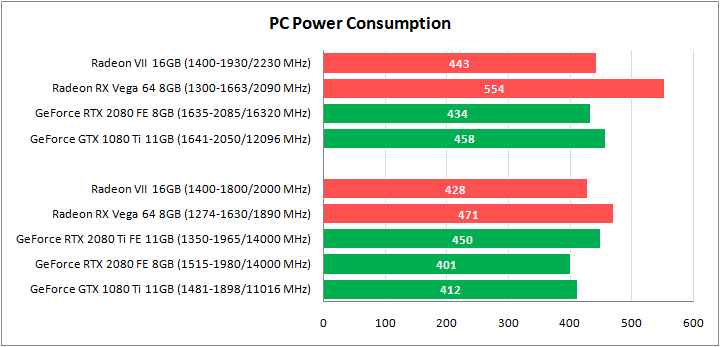 Radeon VII приятно удивил тем, что его показатели заметно ниже потребляемой мощности Radeon RX Vega 64. В номинале видеоадаптеры NVIDIA чуть экономичнее, хотя показатели GeForce RTX 2080 Ti Founders Edition уже выше. В разгоне разница между Radeon VII, GeForce GTX 1080 Ti и GeForce RTX 2080 совсем незначительная. Также надо брать в расчет вероятность погрешности из-за разных блоков питания.