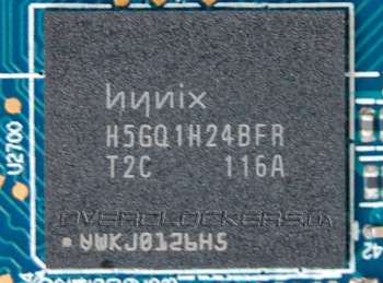 Общий объем памяти в один гигабайт набран восьмью микросхемами Hynix H5GQ1H24BFR T2C, распаянными с двух сторон платы.